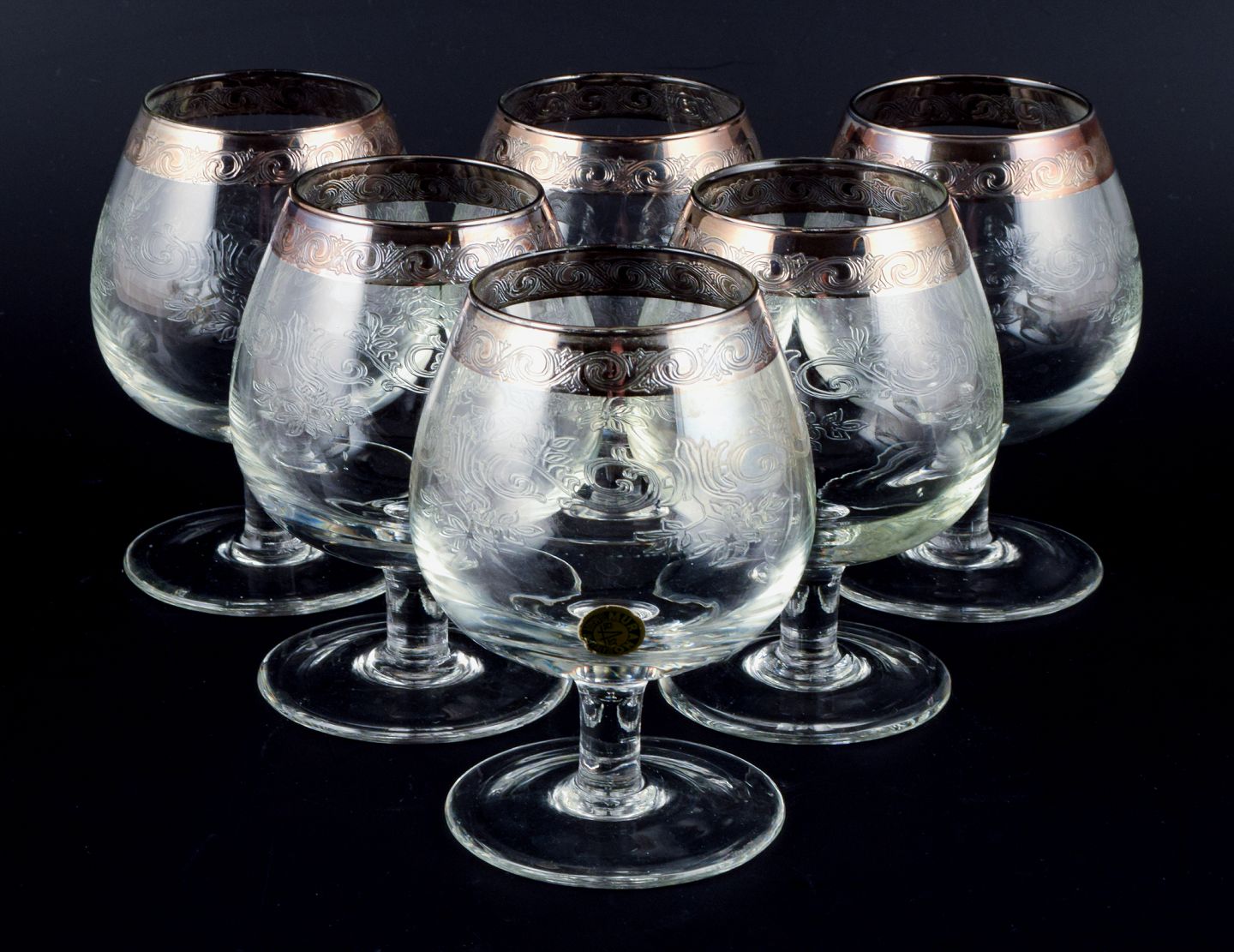 Murano, Italy, six mouth-blown and engraved brandy glasses with silver rim. Mid 20th century. In perfect condition. Sticker. Dimensions: H 11.0 x D 7.0 cm.