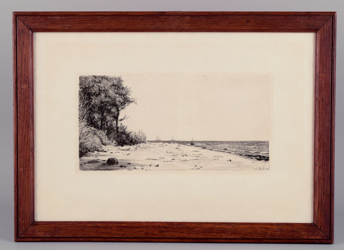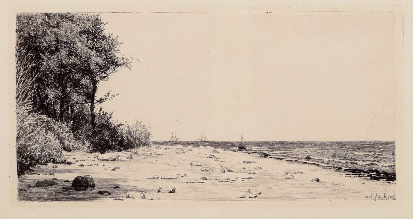 Carl Bloch (1834–1890). Etching of a Danish coastal scene with sailboats on the sea. Hornbæk.