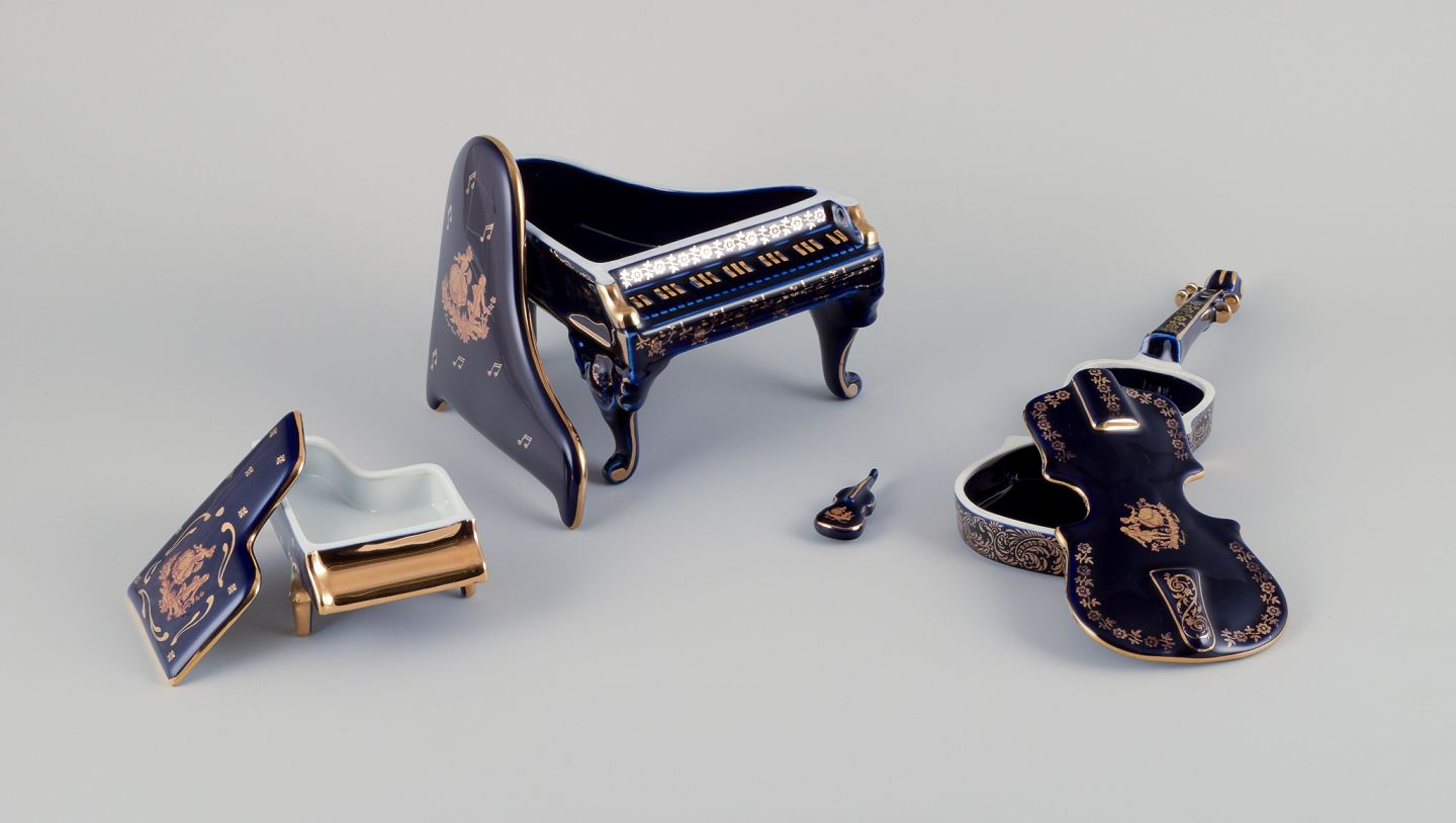 Limoges, France. Four porcelain musical instruments decorated with 22-karat gold leaf and beautiful royal blue glaze. Scène galante.