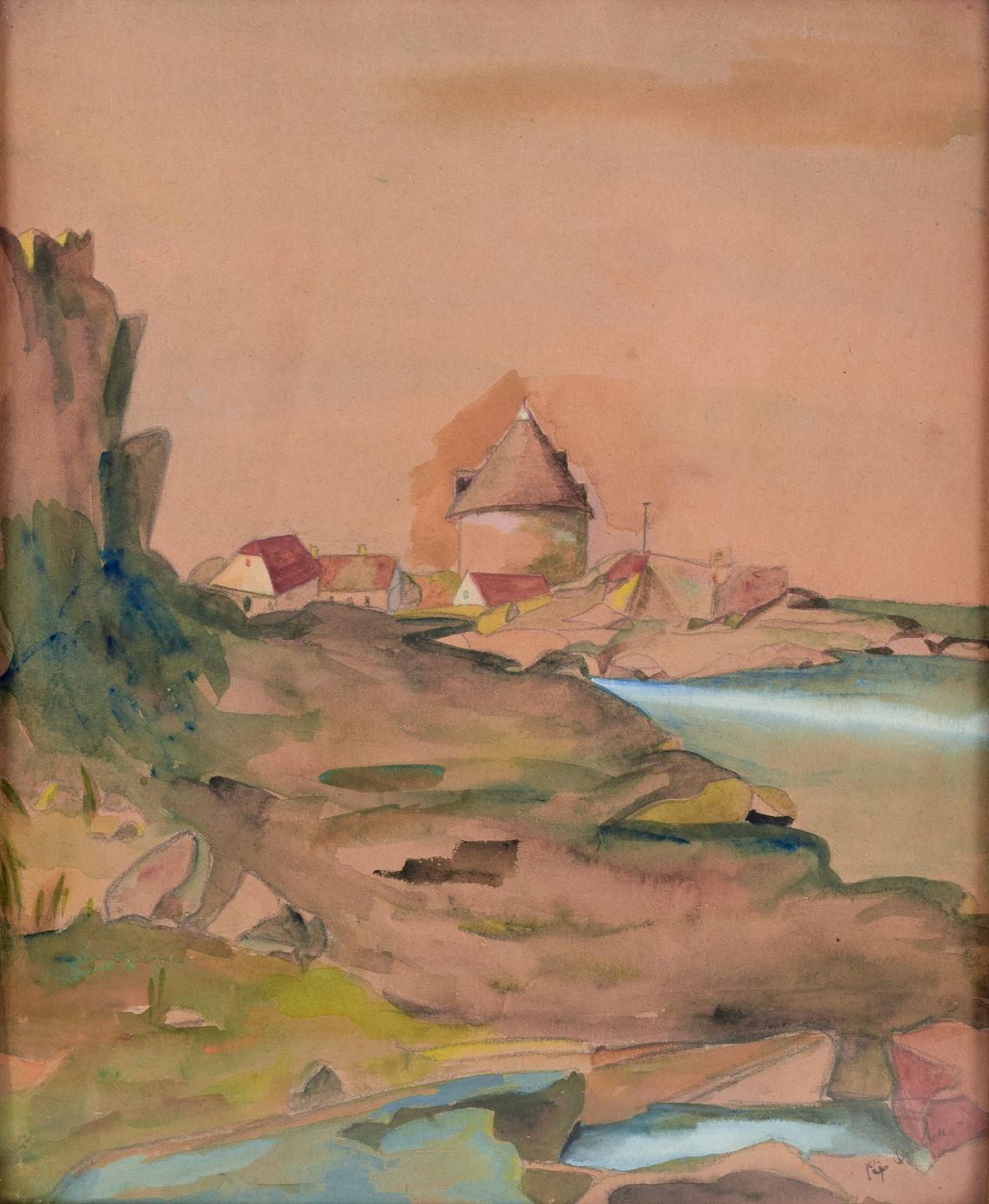 Landscape view from Bornholm with round church by the Baltic Sea.