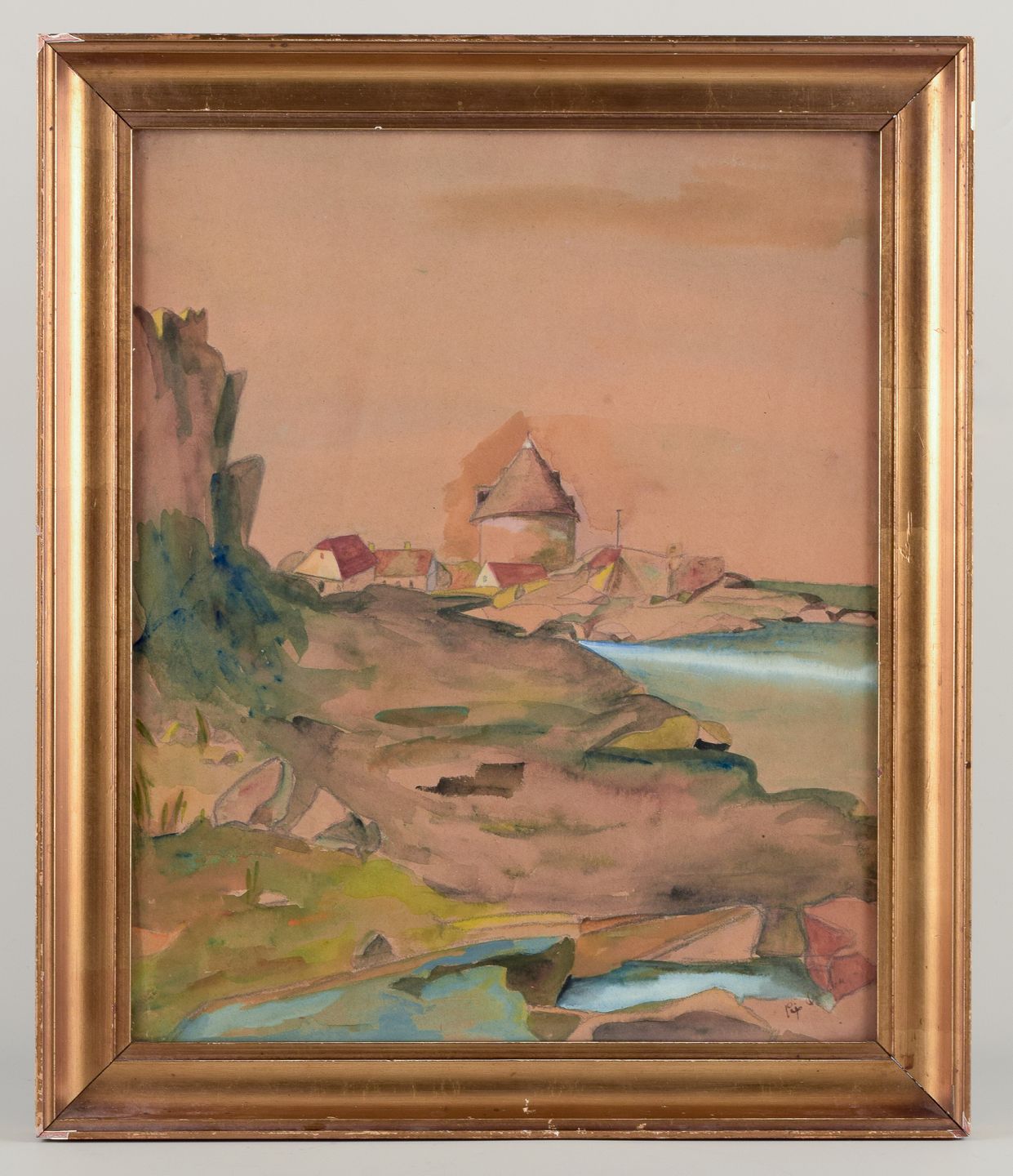 Gold frame from the period. In good condition with chips. Framed behind glass.