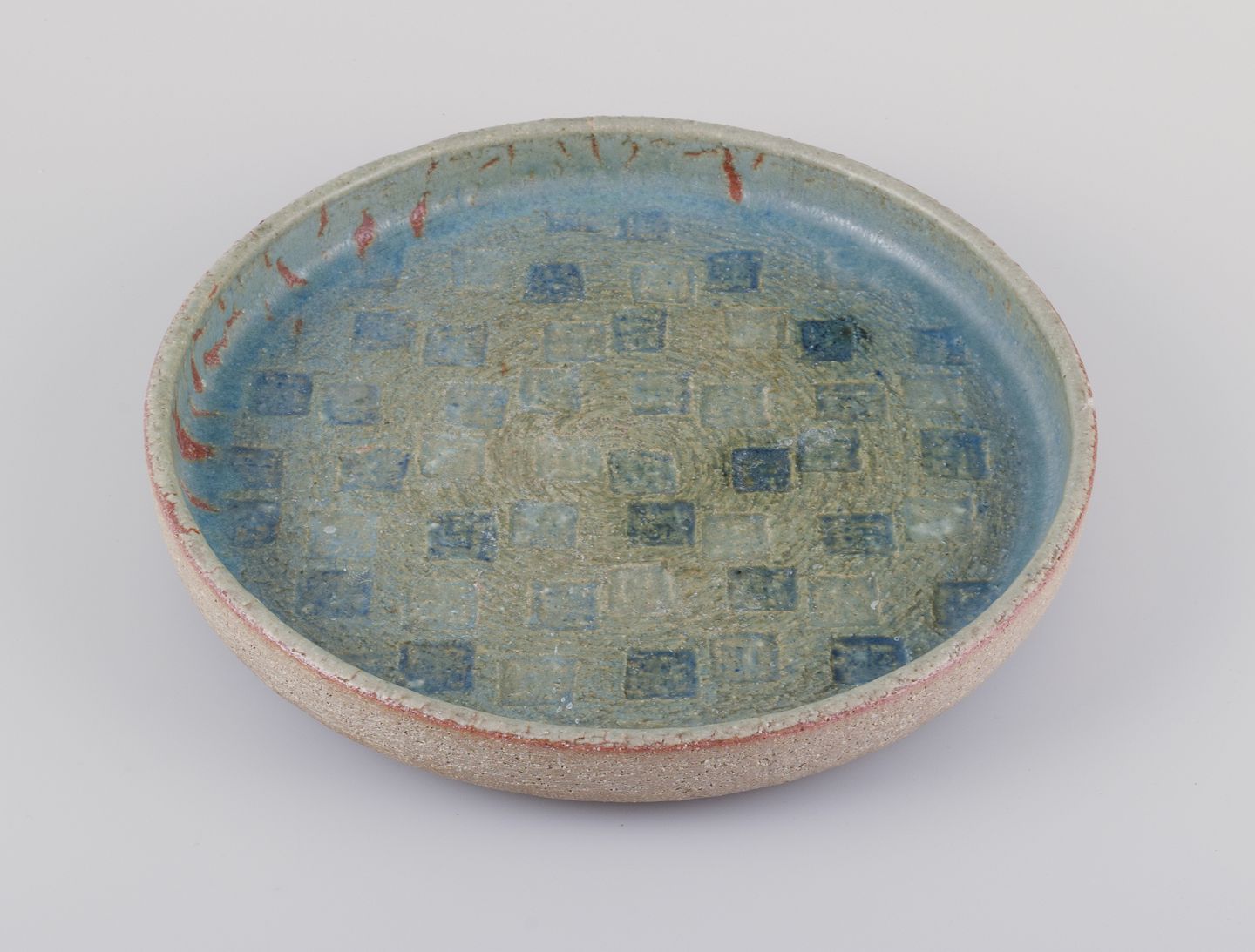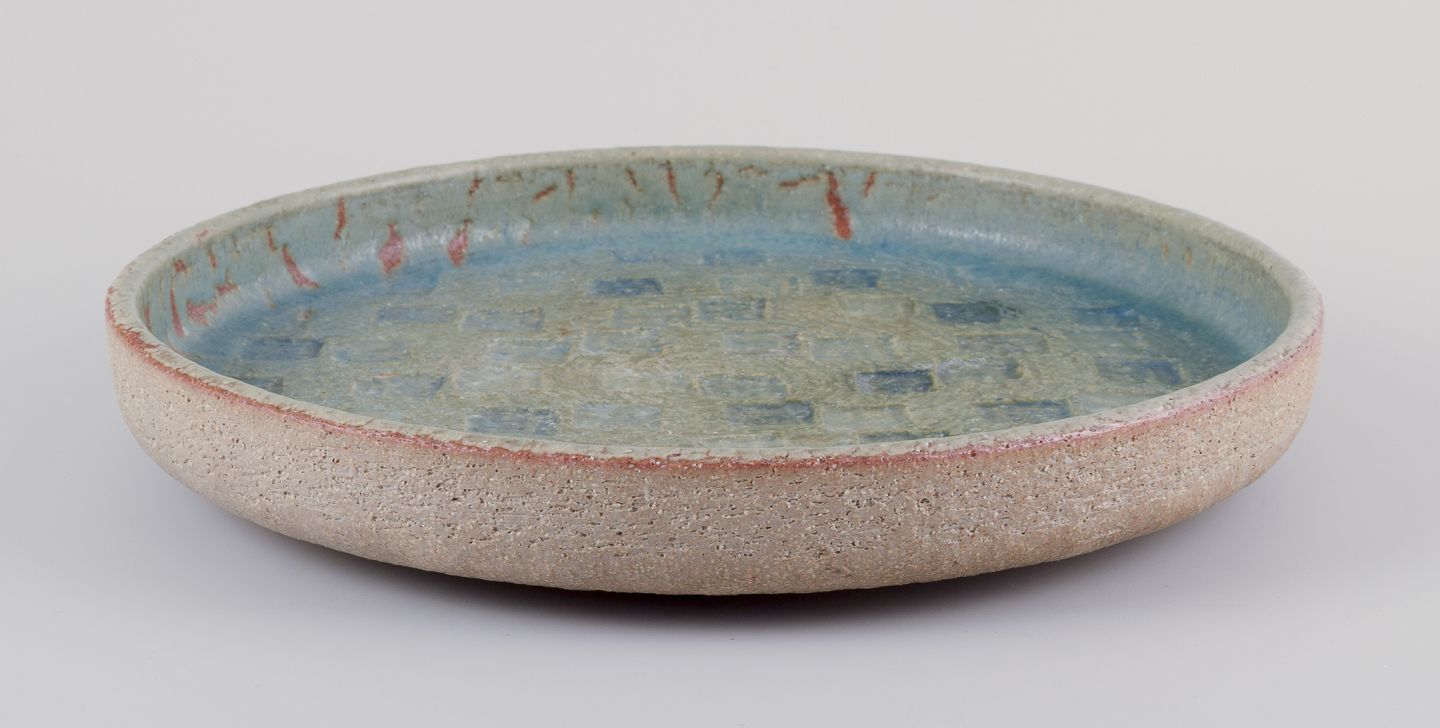 Large stoneware dish, decorated with blue and green glaze.