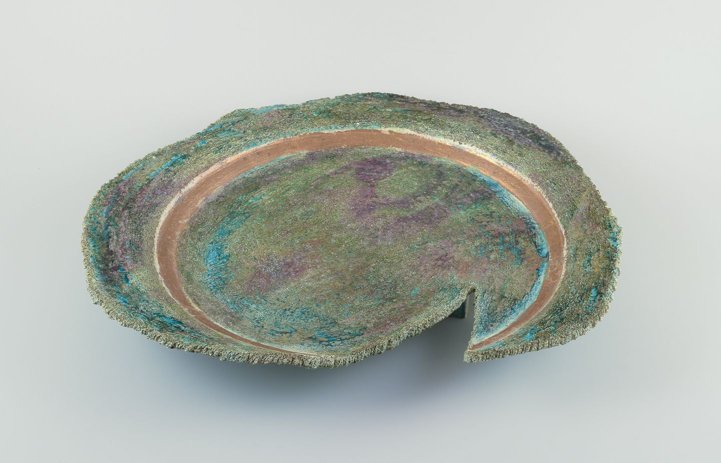 Colossal unique dish of glazed ceramic, on three feet.