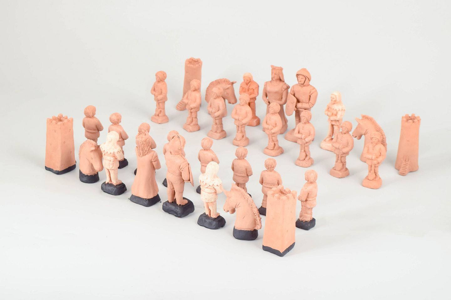 Unique ceramic chess set consisting of a complete set of thirty-two hand-modelled figures executed in unglazed clay. The pieces are designed as stylised human figures and sculptural forms, each with individual character and detailing. Several of the pieces are signed. The set presents an artistic interpretation of a chess game with a strong sculptural character. Created in 1959.