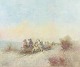 Atmospheric composition depicting a horse-drawn carriage with figures in an open landscape, rendered in a light and delicate palette with soft transitions and a sense of depth. Signed.