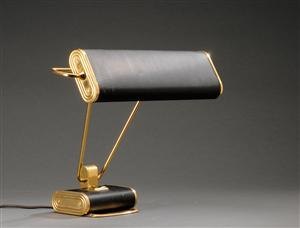 Eileen Gray 1878-1976. Bordlampe, fra 1930-40'erne, udført af messing og bemalet metal. Arm og skærm justerbar. Fabrikeret hos Jumo, Frankrig. H. 35. B. 44 cm. I god stand.