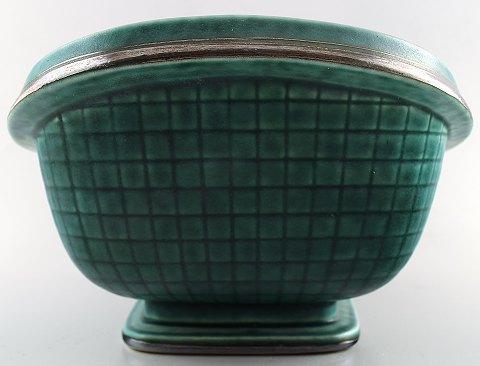 Wilhelm Kåge, Gustavsberg, Argenta Art deco blomsterkumme/ jardiniere dekoreret med blomster. Måler 27 cm. x 11 cm. Stemplet Gustavsberg, Argenta 1212. I perfekt stand.