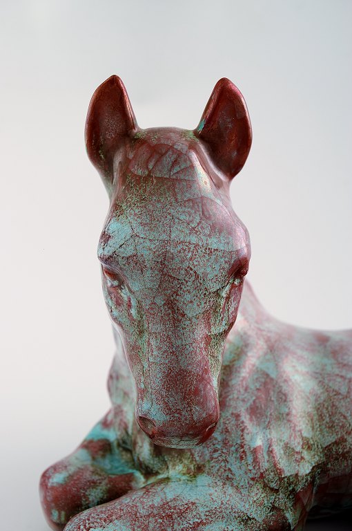 Michael Andersen: liggende føl/hest, stor udgave i grønne og violette nuancer. Måler 26 x 19 cm. I perfekt stand. Stemplet.