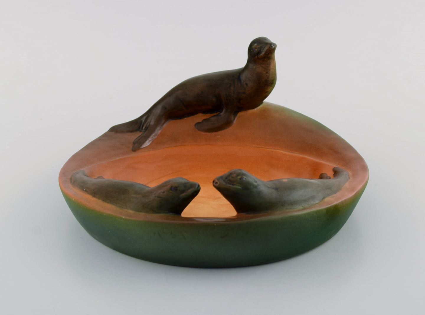 Ipsens enke, Danmark. Fad med søløver i håndmalet glaseret keramik. 1930'erne. Modelnummer 143.