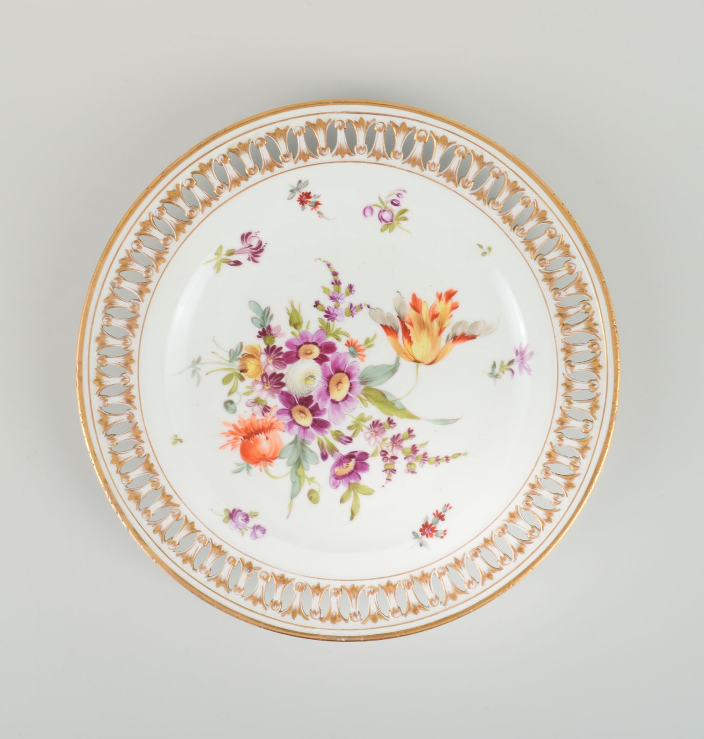 Antik Meissen gennembrudt tallerken i håndmalet porcelæn med blomster og gulddekoration. Sent 1800tallet. Måler: Ø 24,5 X H 3,0 I flot stand. 2. Sortering.