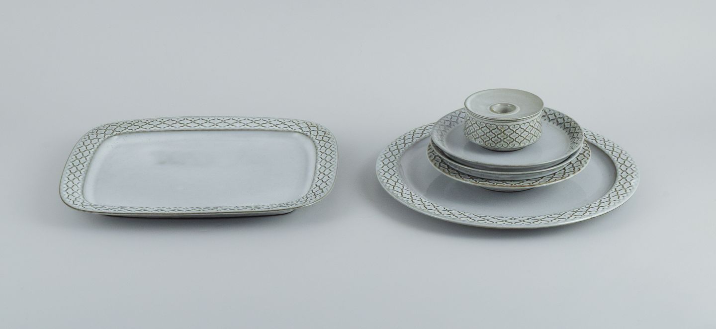 Et rundt fad, et ovalt fad, en lille dyb tallerken, to sidetallerkner og en lysestage.