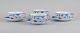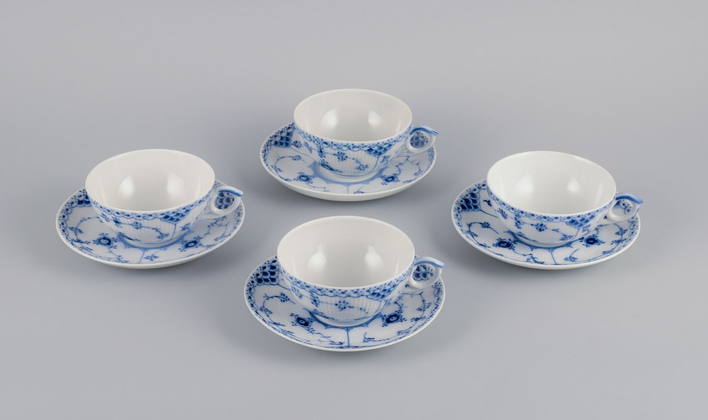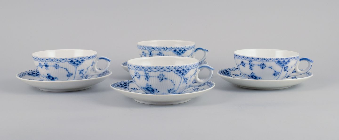 Royal Copenhagen, Musselmalet Halvblonde. Et sæt på fire par tekopper. Model 1/525. Anden og tredje sortering. Stemplet. I perfekt stand. Kop måler: D 9,8 x H 5,0 cm. Underkop; 14,5 cm.