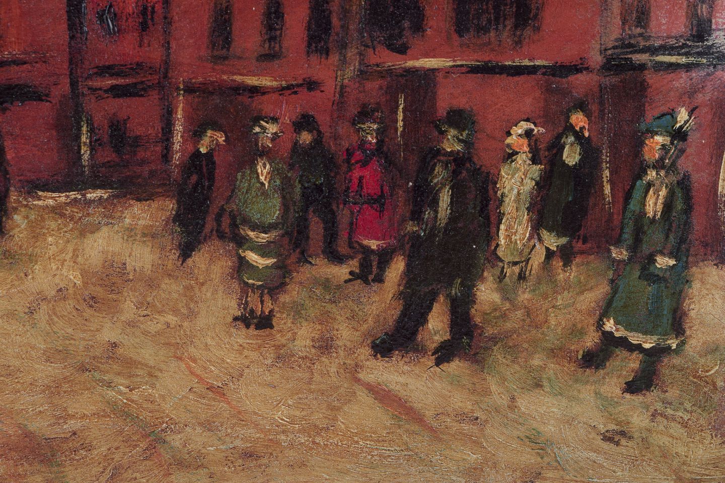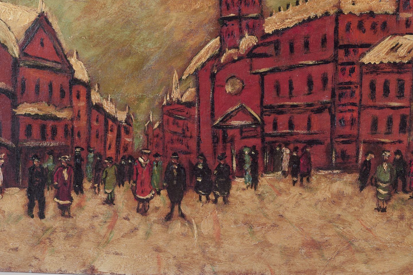 Ubekendt europæisk kunstner. Olie på karton. Snedækket bymotiv med personer i forgrunden. Antageligt østeuropæisk by. 1930/40’erne. Utydeligt signeret. I god stand. Mål: 41,5 cm. x 30,0 cm.