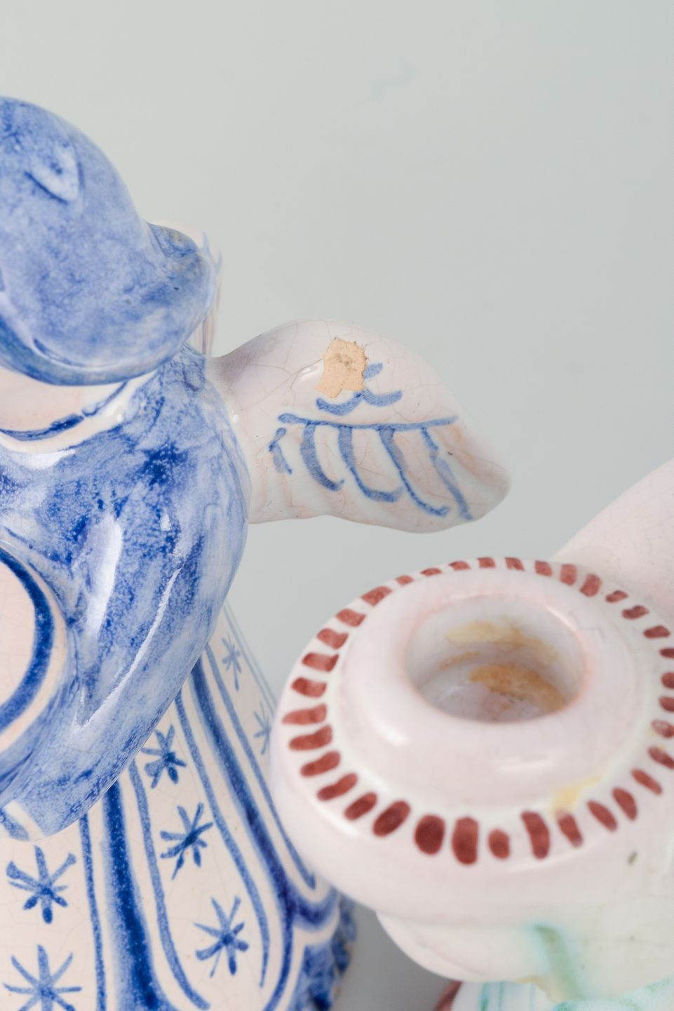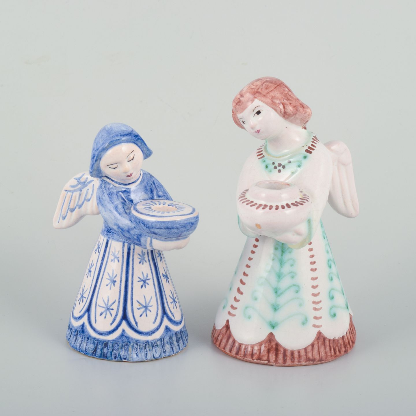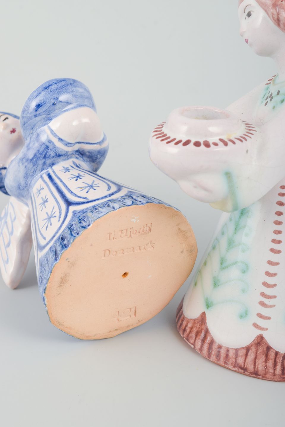 To Hjorth keramiklysestager i form af engle, udført i glaseret fajance og hånddekoreret i blå og grønne nuancer. Figurerne forestiller to stående engle med lysestage/holder foran sig. Den ene engel er dekoreret i blå og hvid med stjernemotiver, den anden i grøn, brun og hvid med slyngede bladmønstre. Begge med fint malede ansigtstræk og detaljerede vinger.