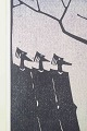 Et dramatisk grafisk værk, hvor tre stiliserede skikkelser – de vise mænd – nærmer sig Maria, der fremstår som en ikonisk figur integreret i træets form. Den monumentale enkelhed, de stærke kontraster og motivets symbolske tyngde vidner om Holms særlige evne til at forene det religiøse billedsprog med en stram modernistisk æstetik.