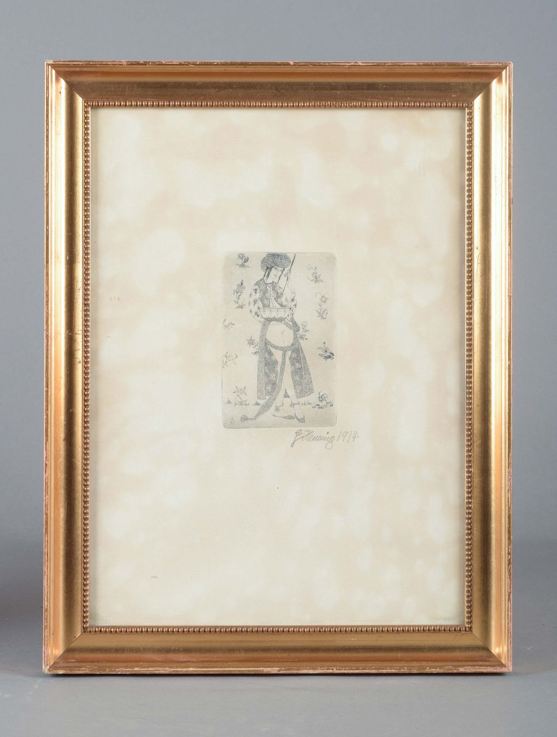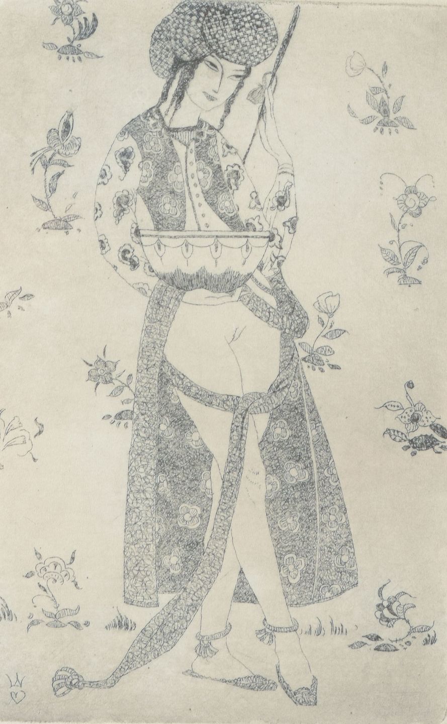 Dette raffinerede blad af Gerhard Henning demonstrerer kunstnerens evne til at forene en næsten ornamental ornamentik med en udpræget sans for linjeføringens rytmiske elegance. Figuren, med sine orientalsk inspirerede dragtdetaljer, træder frem som et symbol på en tid, hvor europæisk kunst søgte mod det eksotiske og det dekorative som modbillede til den strenge naturalisme.