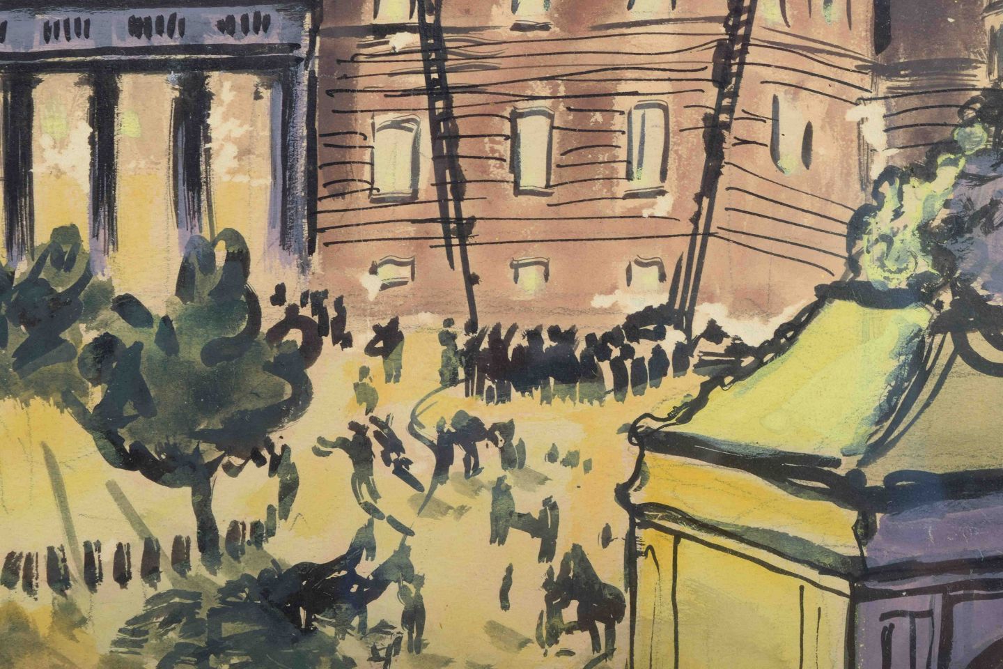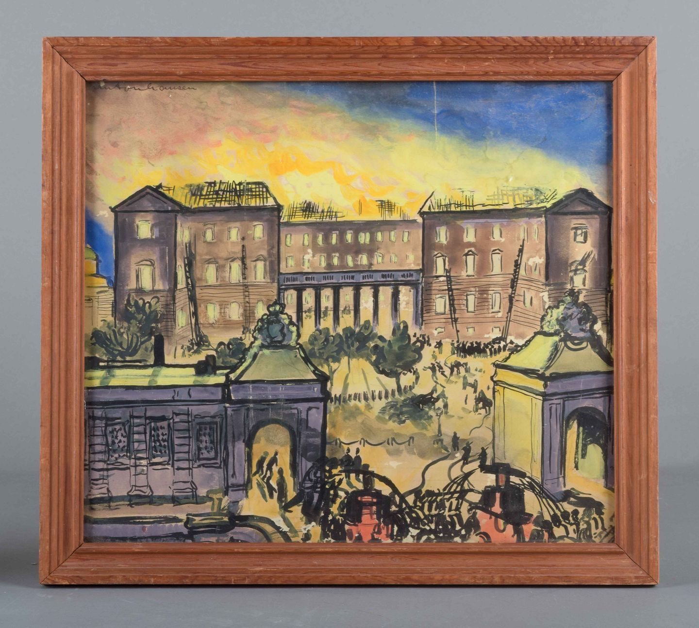 Et ekspressivt værk, hvor Anton Hansen skildrer den dramatiske brand på Christiansborg Slot i 1884. Med hurtige penselstrøg og en glødende himmel fanger han både den historiske katastrofe og den menneskelige tilskuerflok foran slottet.