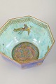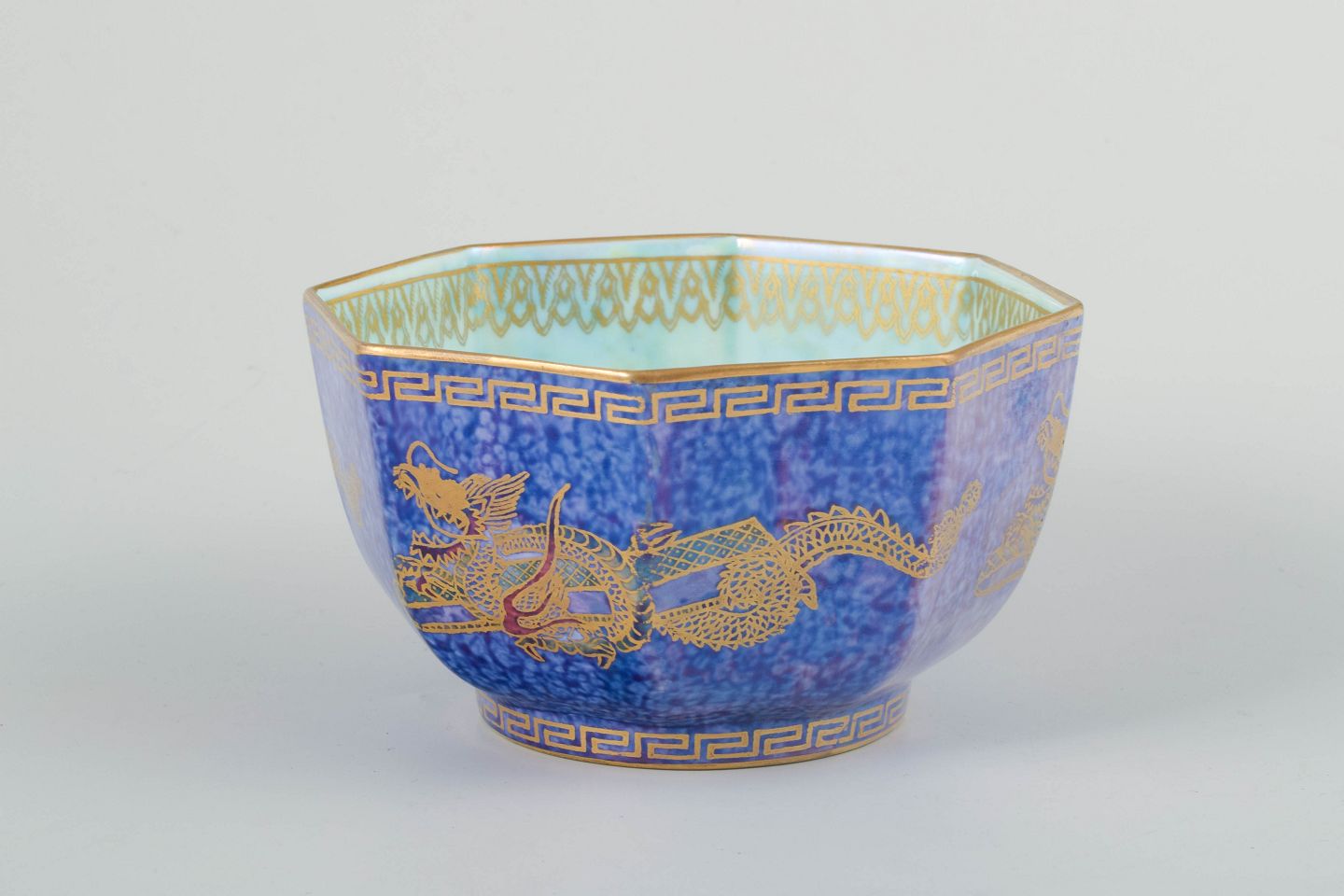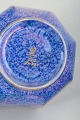 Ottekantet skål i blå-lilla lustre ware, dekoreret med gulddetaljer. Ydersiden prydet med dragemotiv, indersiden med fabeldyr og blomsterornamentik. Design af Daisy Makeig-Jones.