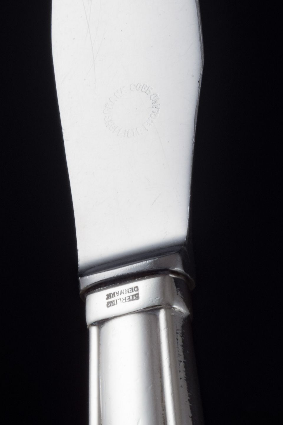 Frokostkniv i mønsteret "Liljekonval" (Lily of the Valley). Blankpoleret sterling sølv, elegant skaftafslutning med diskret blomster- og bladmotiv.