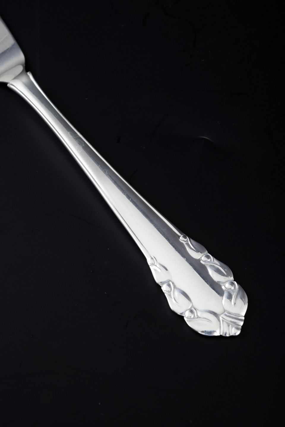 Fiskekniv i mønsteret "Liljekonval" (Lily of the Valley). Blankpoleret sterling sølv, elegant skaftafslutning med diskret blomster- og bladmotiv.