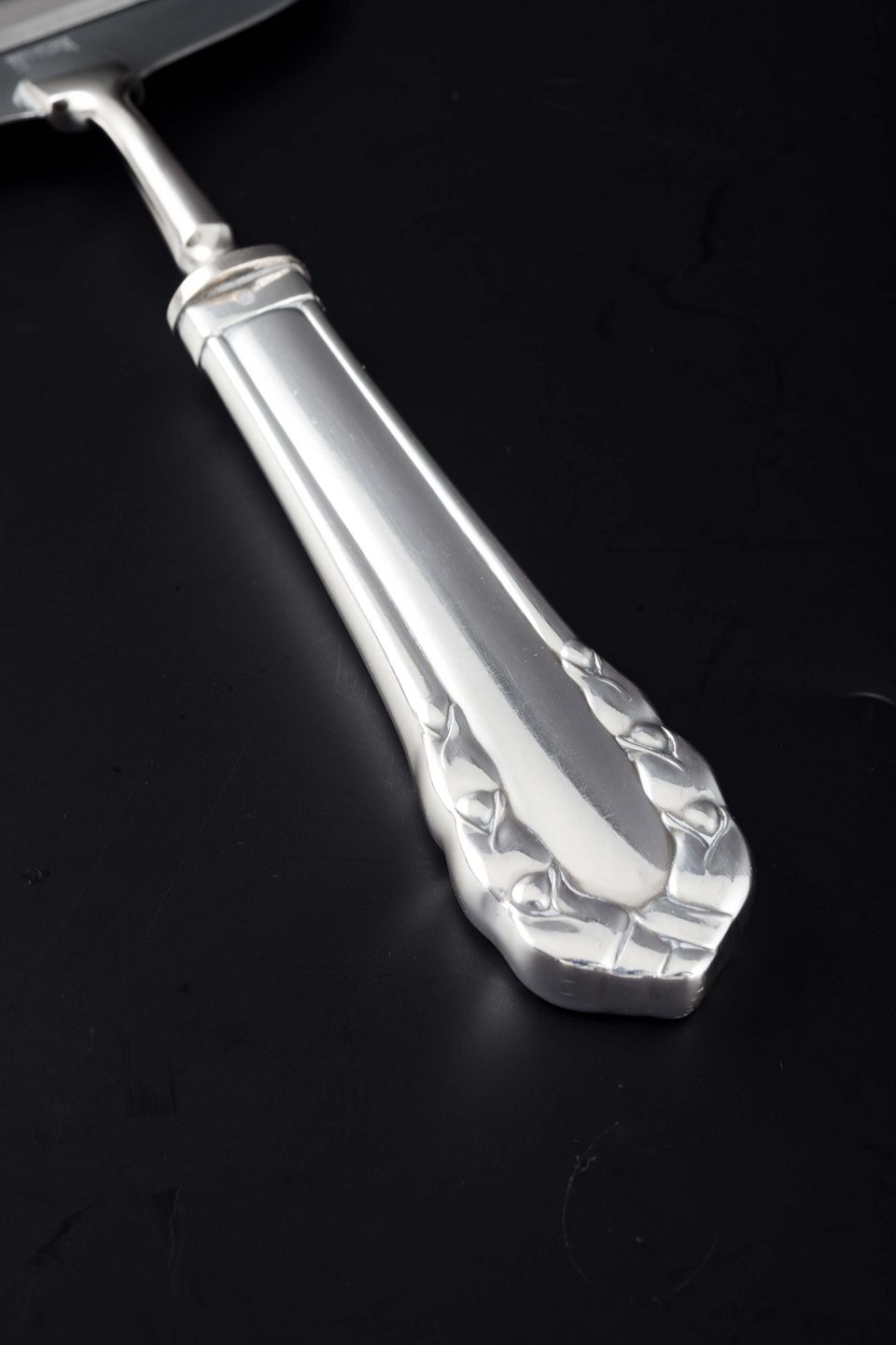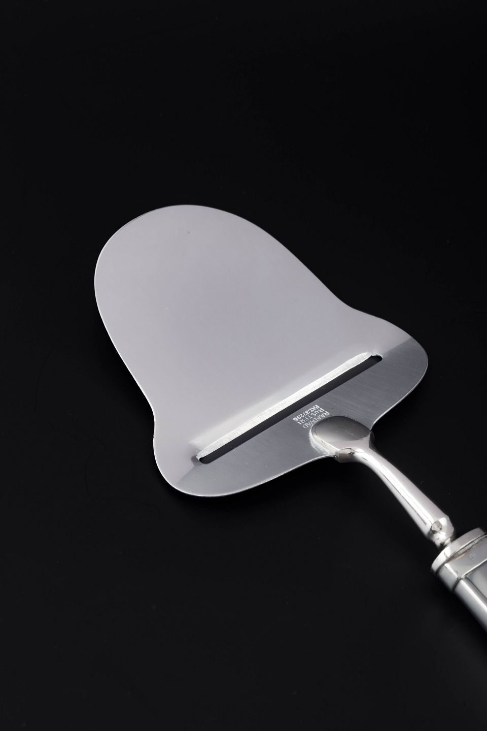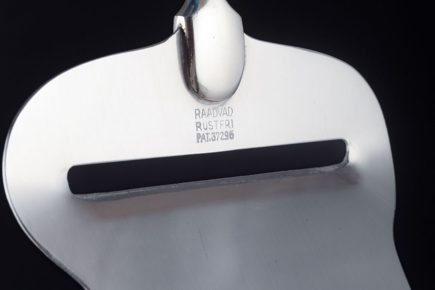 Ostehøvl i mønsteret "Liljekonval" (Lily of the Valley). Blankpoleret sterling sølv, elegant skaftafslutning med diskret blomster- og bladmotiv.