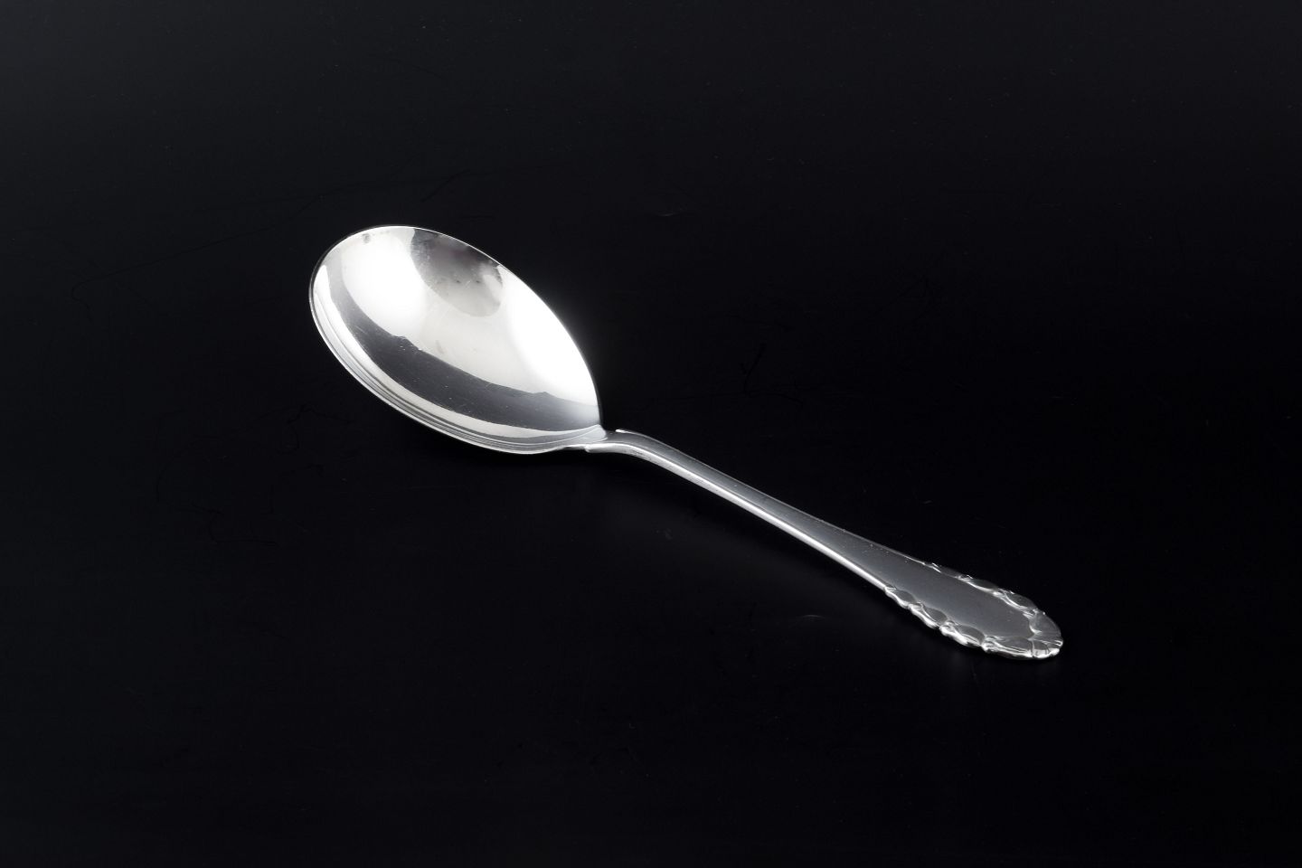 Stor serveringsske i mønsteret "Liljekonval" (Lily of the Valley). Blankpoleret sterling sølv, elegant skaftafslutning med diskret blomster- og bladmotiv.