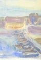 Et stemningsfuldt akvarelmaleri af Aksel Møller fra 1958, der skildrer et kystlandskab med huse, både og brede horisonter. Værket er præget af lette, transparente farvelag i blå og violette toner, der fremhæver en poetisk og impressionistisk stemning.