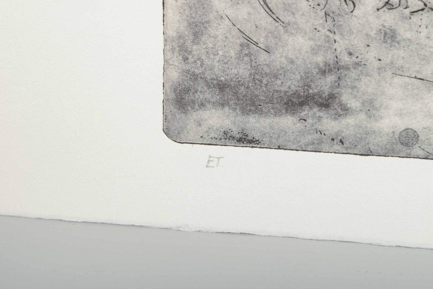 Et grafisk værk udført som radering med fine og komplekse linjer, hvor motivet fremstår næsten abstrakt med antydninger af figurer og bevægelser. Værket demonstrerer Nørgårds sans for at indfange en stemning gennem et rytmisk spil af linjer og flader.