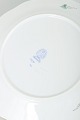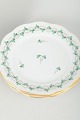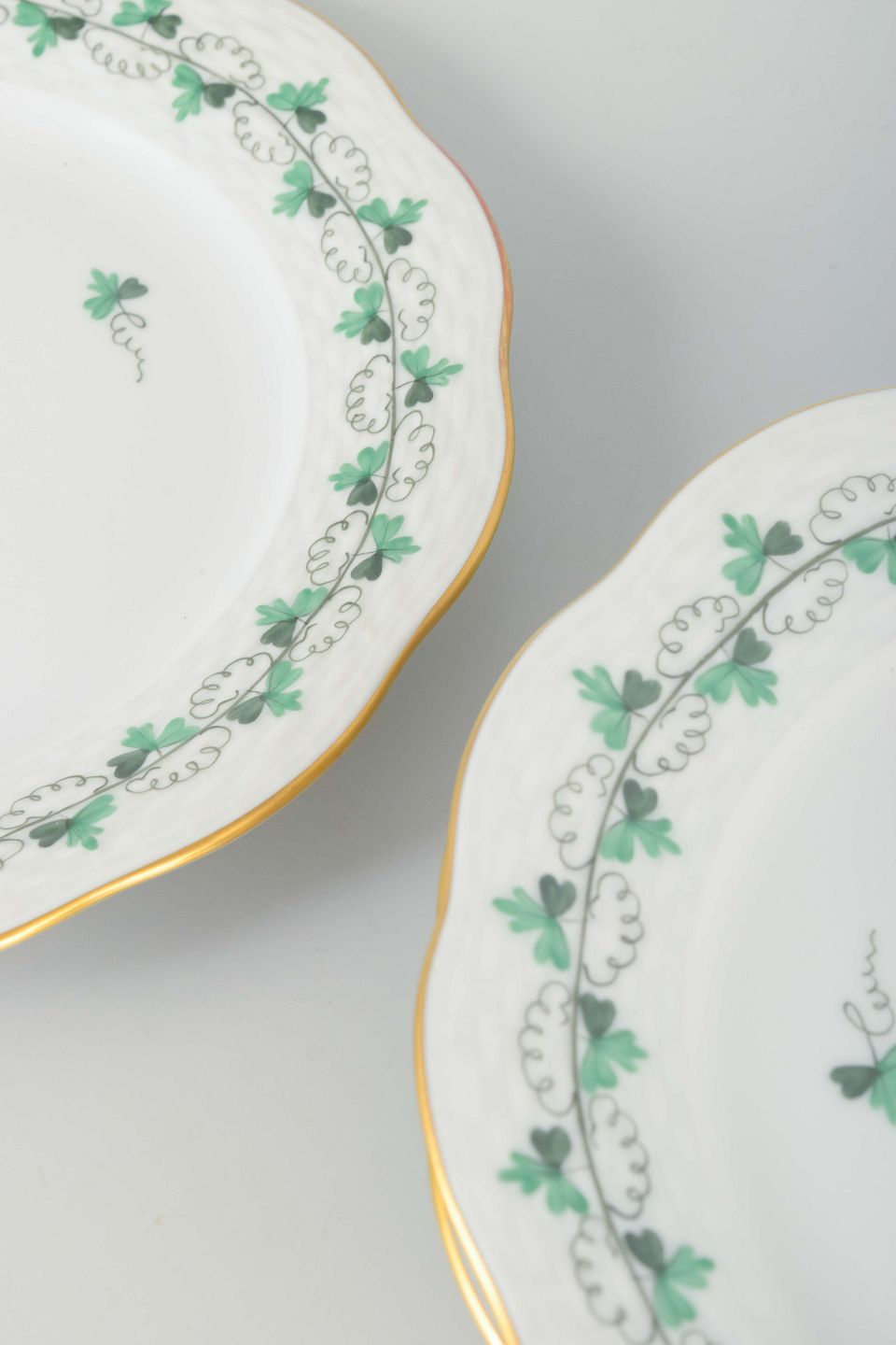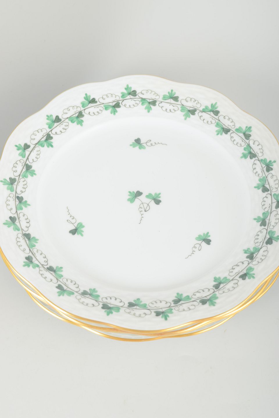 Sæt af seks porcelænstallerkener med håndmalet grønt bladdekor og forgyldte kanter. Klassisk form med svungen rand og elegant dekoration.