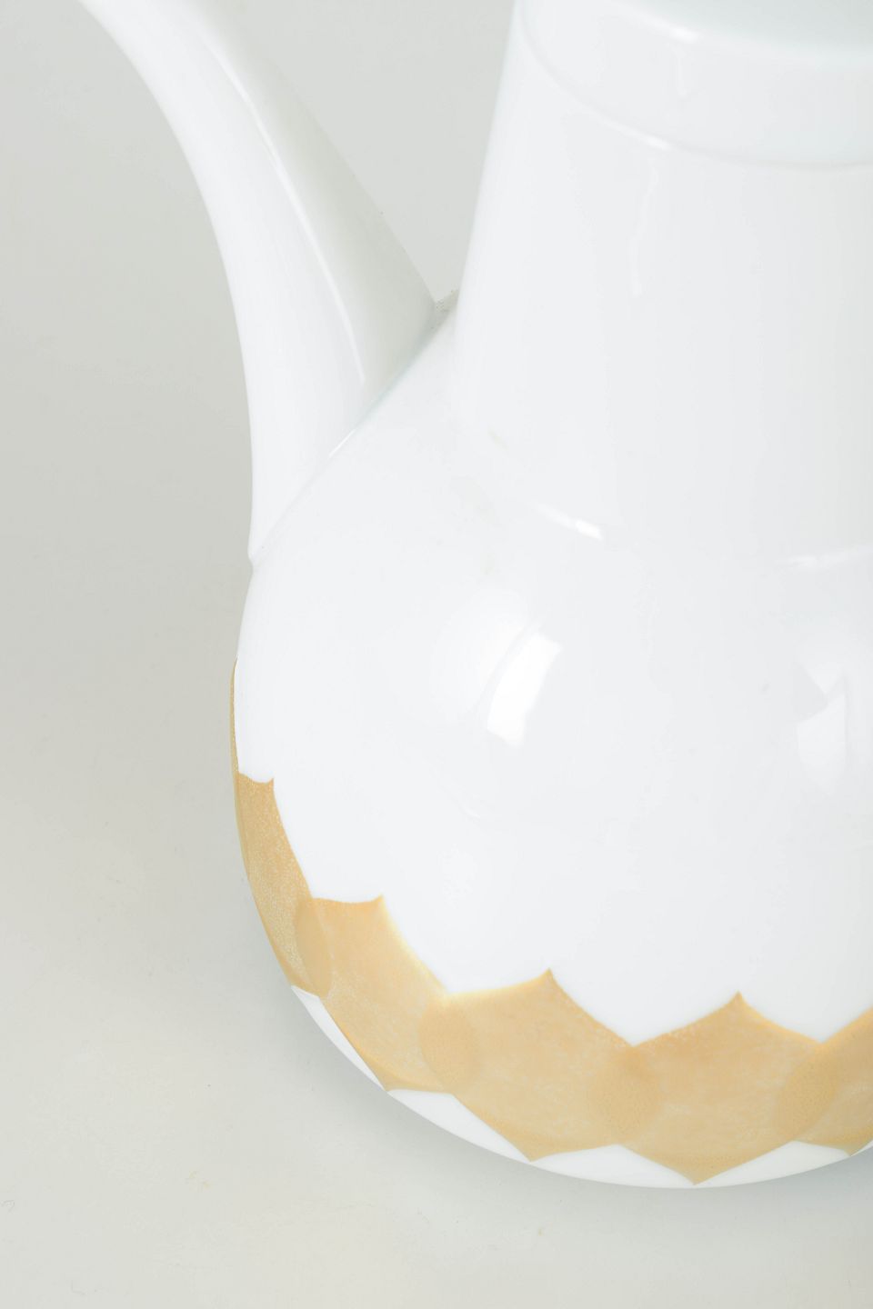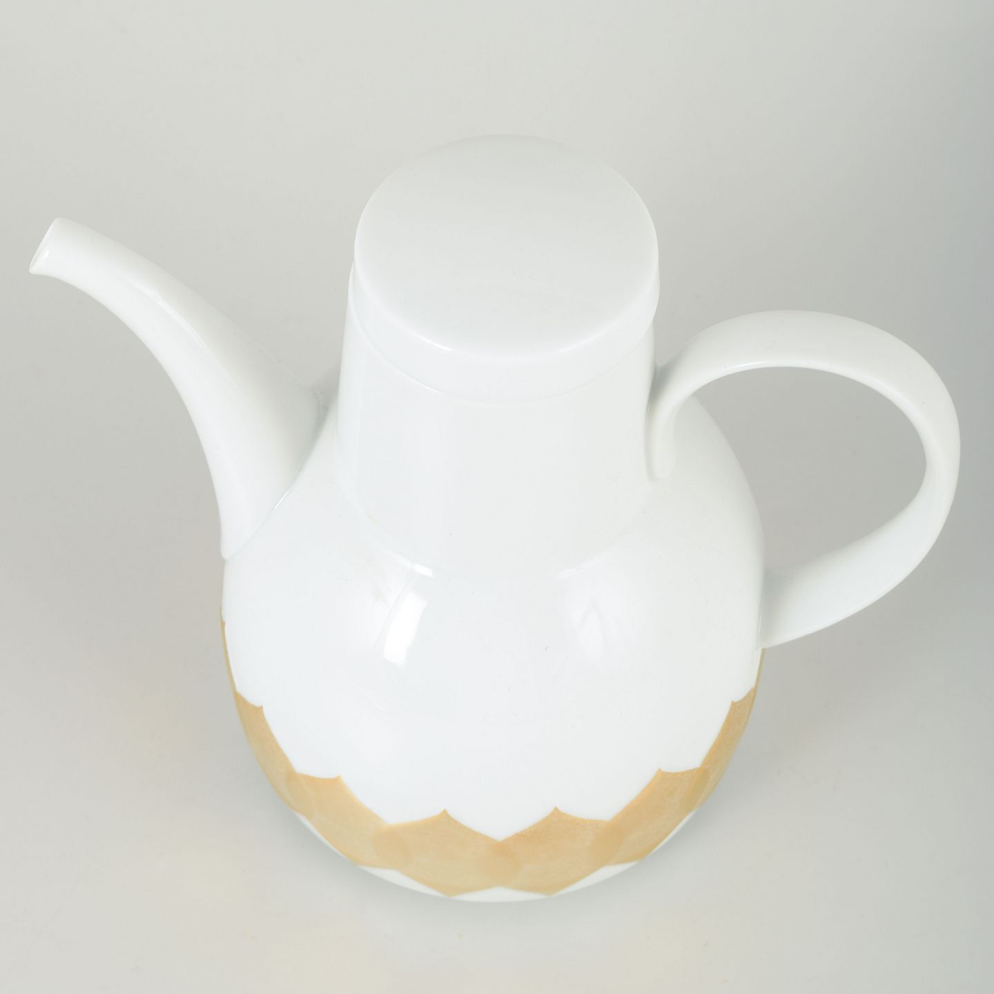 Elegant kaffekande i porcelæn med hvid glasur og geometrisk gulddekor rundt om korpus. Klassisk design fra Rosenthals Studio-Line serie, kendt for kombinationen af funktionalitet og moderne formsprog.