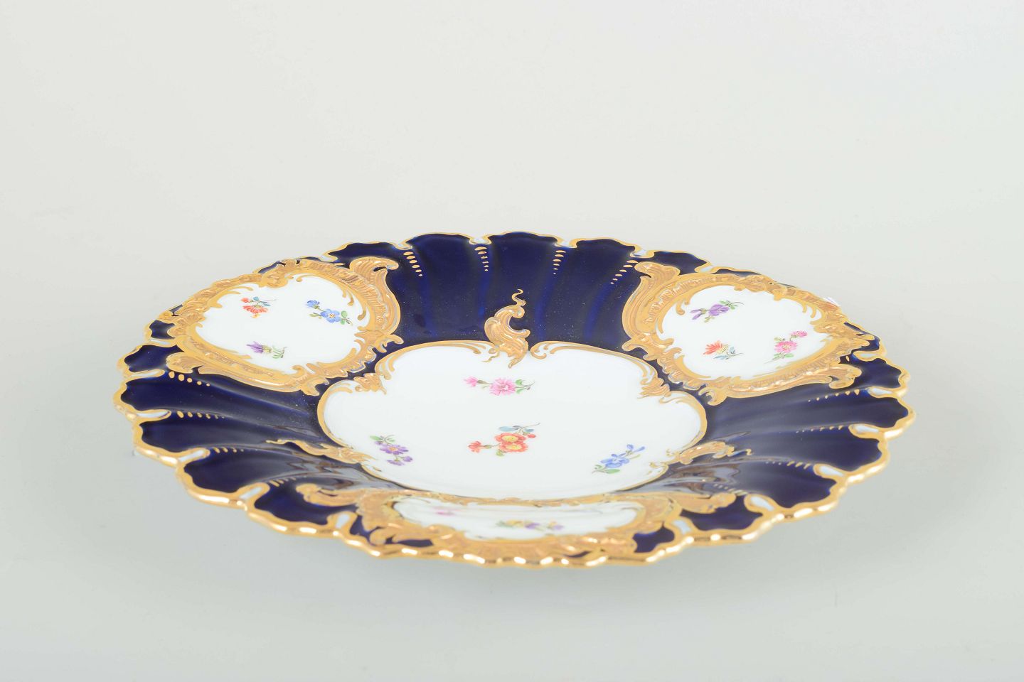 Porcelænsfad med svungne kanter, koboltblå glasur, håndmalede blomsterdekorationer samt rigt håndmalet guldbemaling. Første sortering. Perfekt stand.