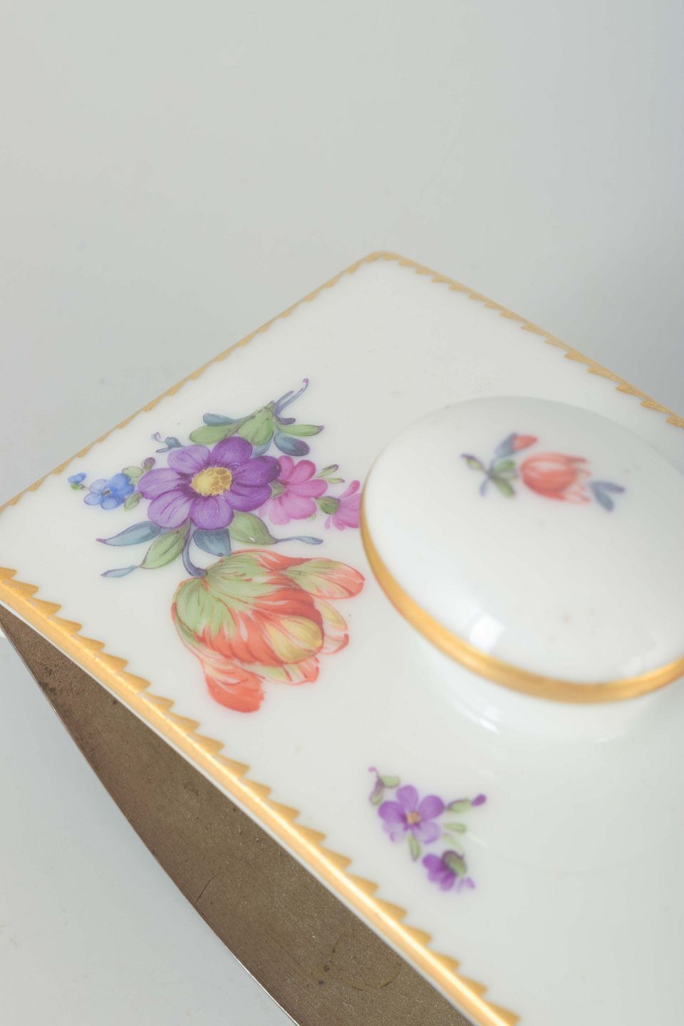 Porcelæns blæksuger med håndmalede blomster i det klassiske “Sachsisk Blomst” mønster, guldkant og knopformet håndtag.