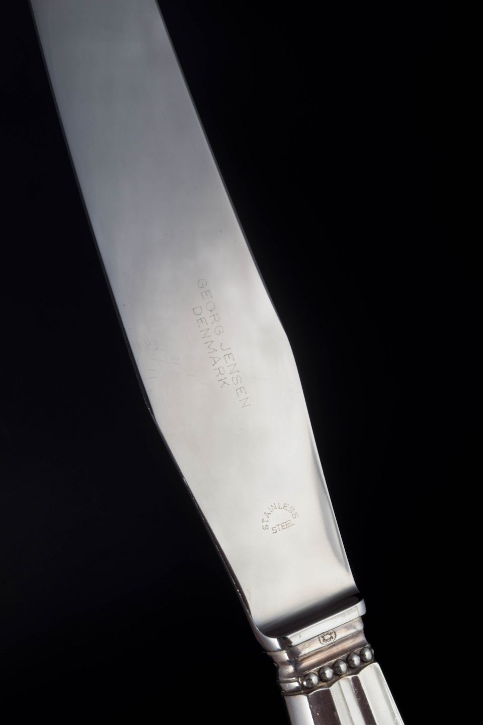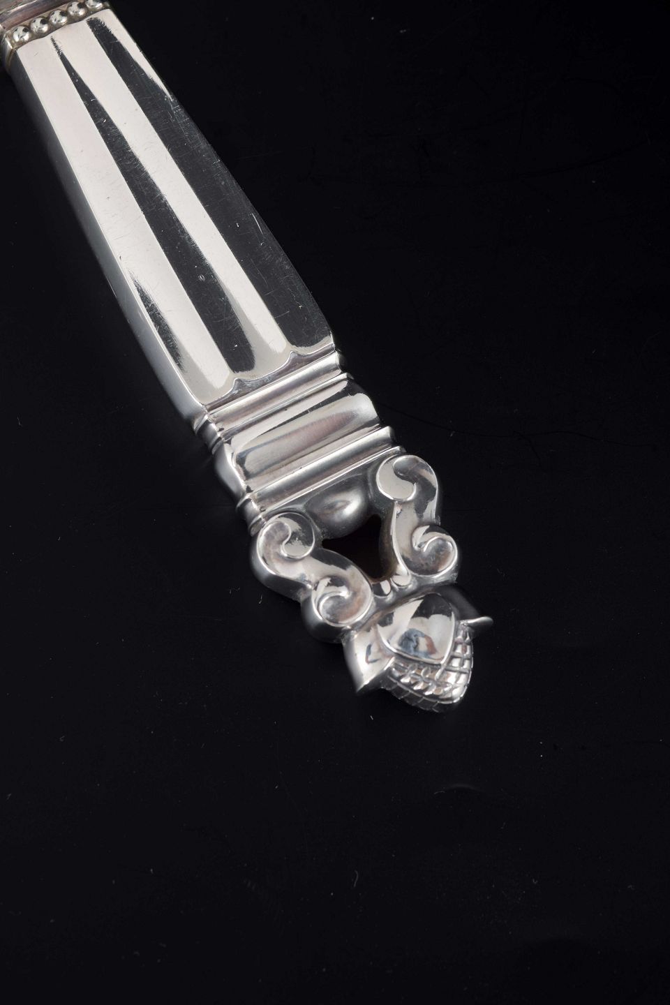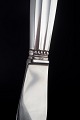 Elegant lang middagskniv i det klassiske “Konge / Acorn”-mønster, designet af Johan Rohde i 1915. Skaftet er udført i sterlingsølv, mens bladet er i rustfrit stål.