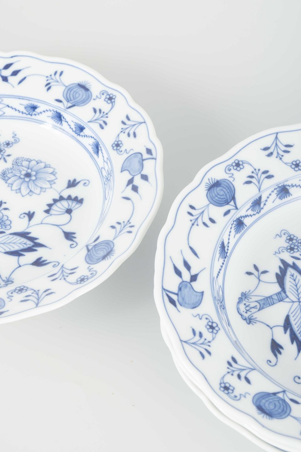 Fire håndmalede dybe porcelænstallerkener i det klassiske “Løgmønstret” (Blue Onion) mønster. Dekoreret i underglasurblå med bølget kant og elegant ornamentik.