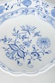 Elegant firkantet skål i hvidt porcelæn med blå underglasurdekoration i det klassiske “Løgmønstret” (Blue Onion) mønster. Let bølget kant med svungne linjer og fint håndmalet ornamentik.