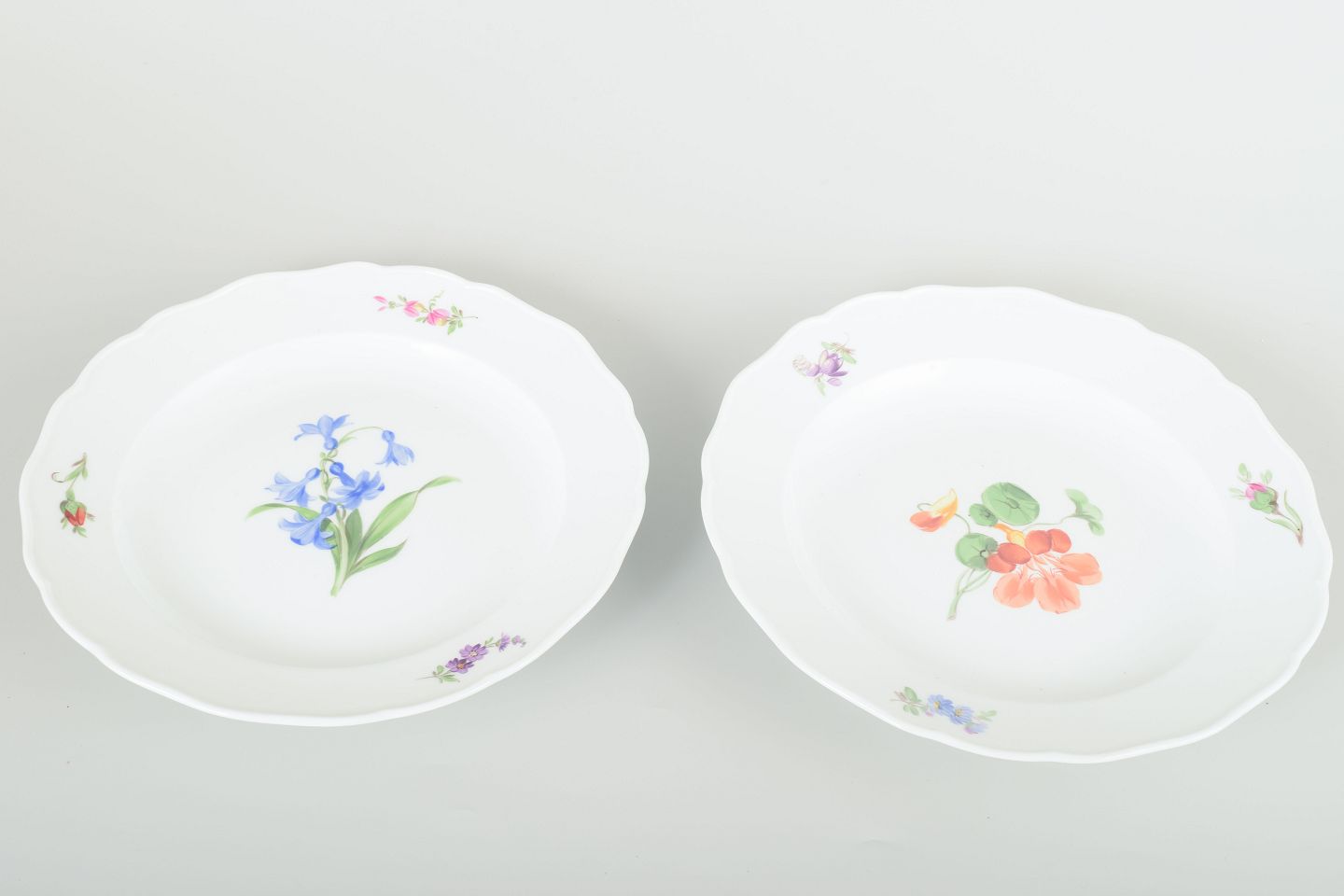 To tallerkener i porcelæn, håndmalede med blomsterdekorationer i flerfarvet palet. Klassisk bølget kantprofil med relief og delikat staffering.