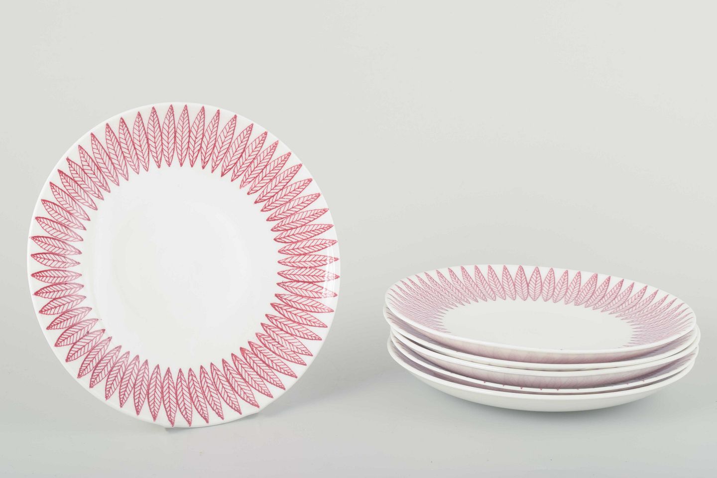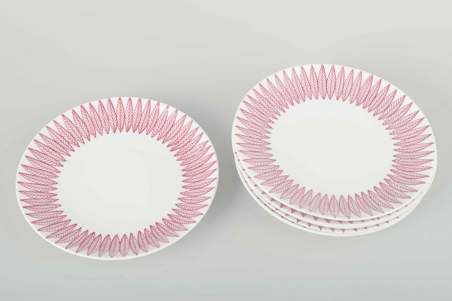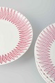 Sæt på seks kagetallerkener i fajance med det karakteristiske “Salix”-mønster i rød på hvid bund, designet af Stig Lindberg.