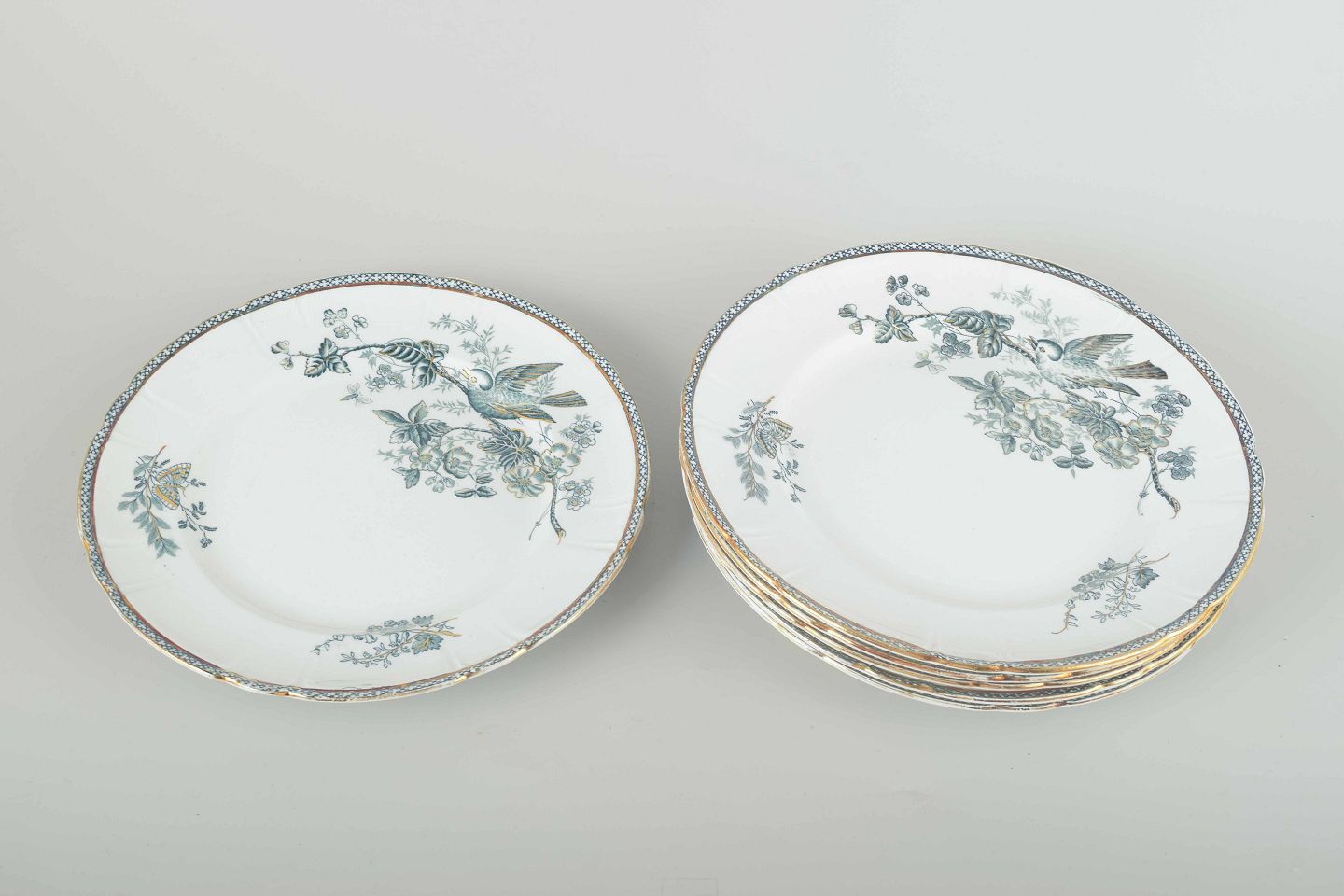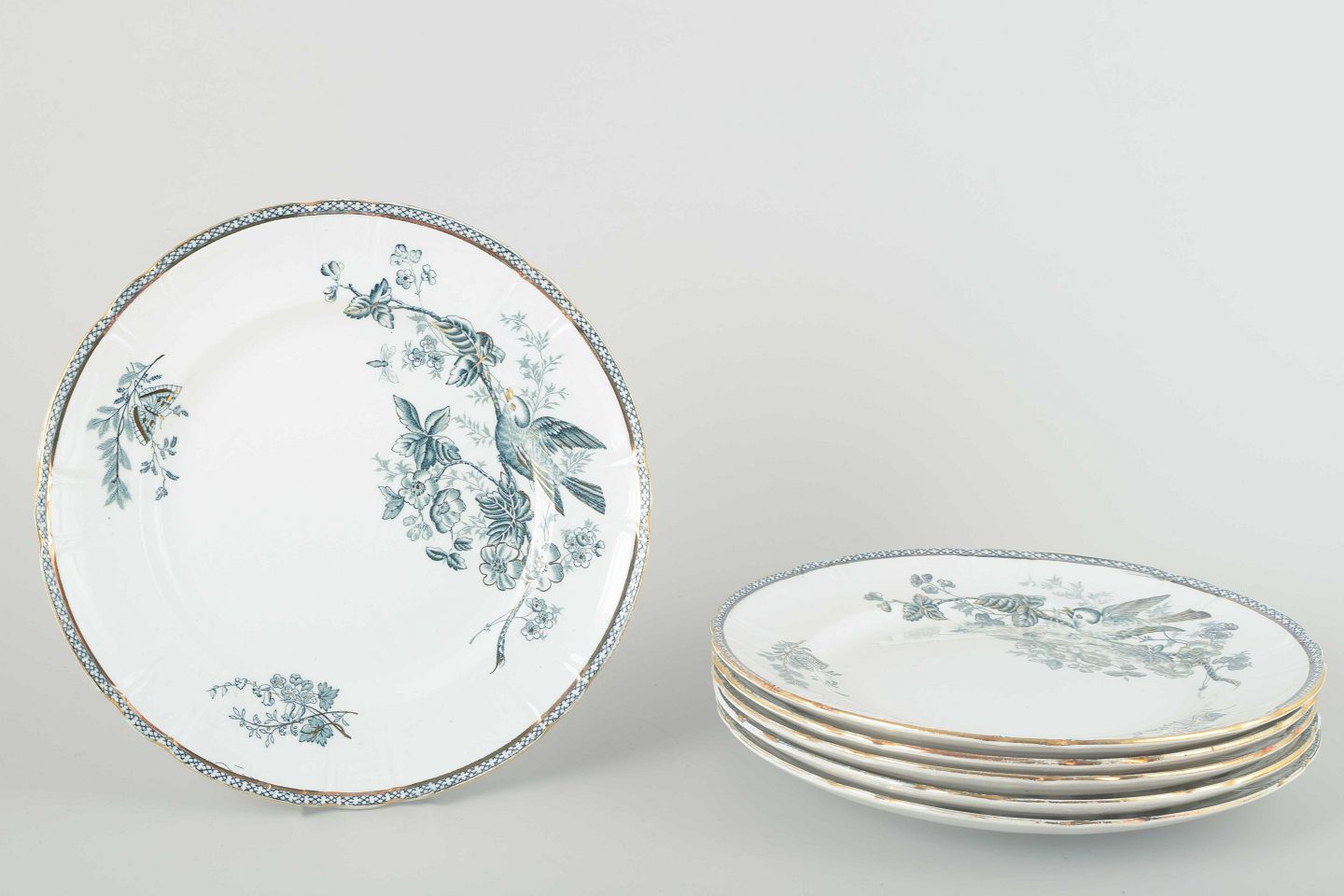 Seks frokosttallerkener i fajance med dekoration af fugl og blomstergren i blågrønne nuancer samt dekorativ bort langs kanten.