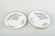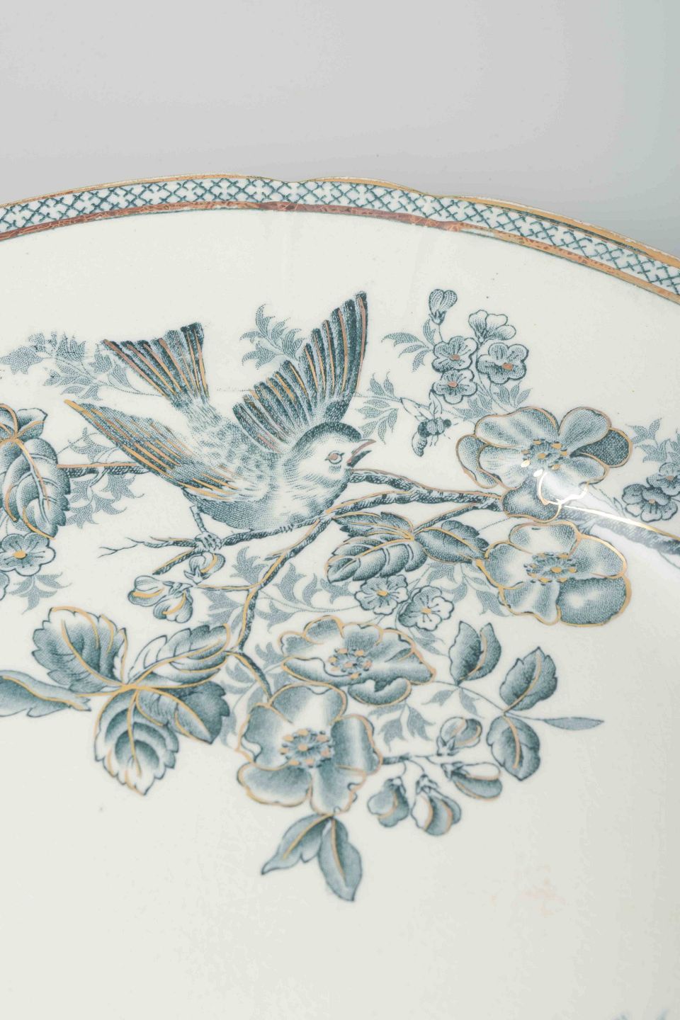 Fem middagstallerkener i fajance med dekoration af fugl og blomstergren i blågrønne nuancer samt dekorativ bort langs kanten.