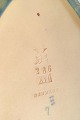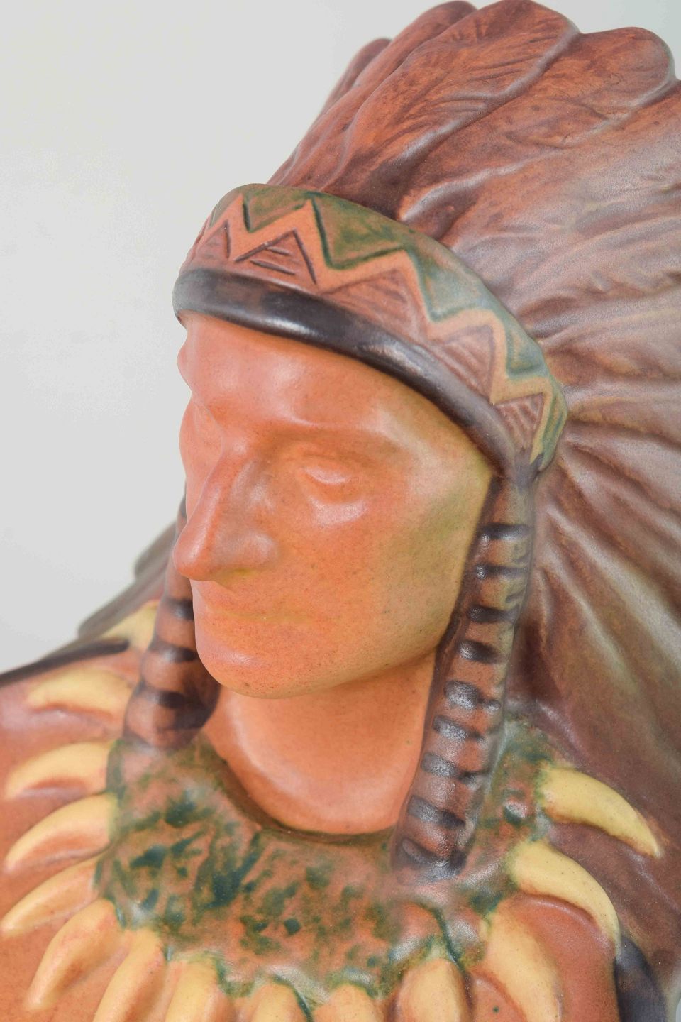 Dekorativ skål med reliefformet buste af en nordamerikansk indianer iført fjerprydet hovedbeklædning og halskæde af kløer. Glasur i dæmpede grønne, brune og orange nuancer. Et karakteristisk figurativt arbejde fra Ipsens Enke, 1920’erne.