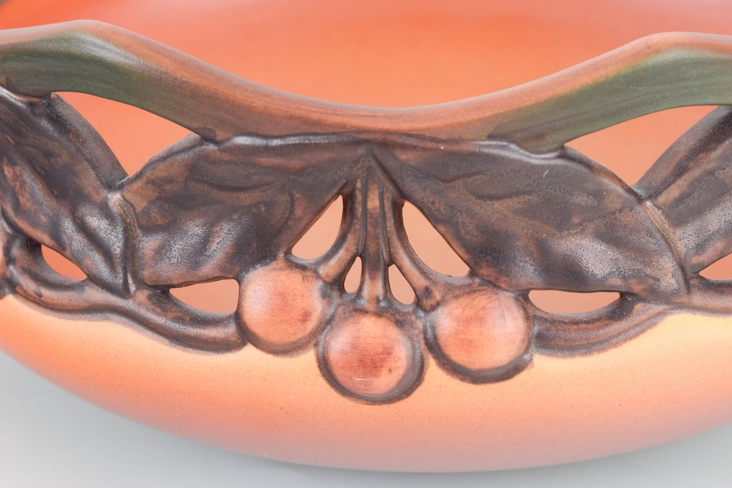 Art Deco-/sen Art Nouveau-inspireret skål i glaseret keramik med gennembrudt bort og plastisk modelleret dekor af kirsebær og blade i brune og grønne nuancer. Mat orange grundglasur med elegant toning mod bunden.
