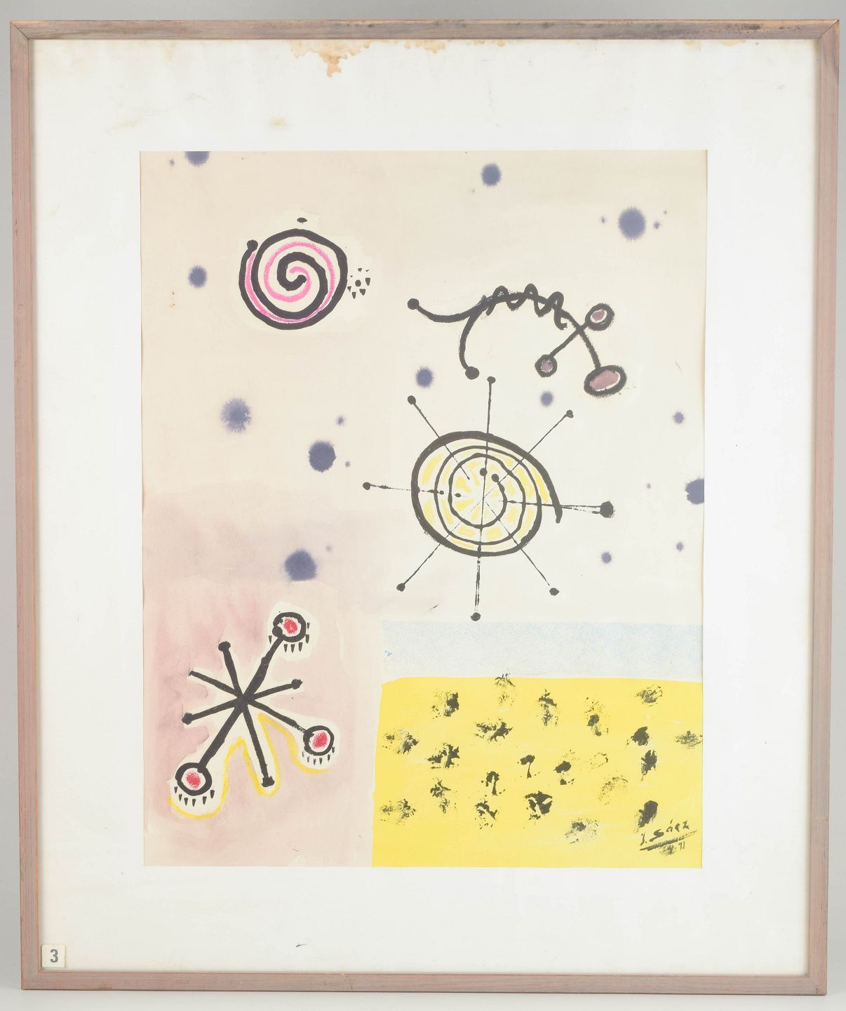 Et poetisk abstrakt værk med kosmiske og biomorfe former udført i bløde pastelfarver. Spiralfigurer, svævende prikker og radierende strukturer minder om planetariske eller mikroskopiske konstellationer, der udfolder sig på en flade i sarte rosa, elfenbens- og gulnuancer. Udtrykket er intuitivt, lyrisk og grafisk med et klart surrealistisk præg fra midten af det 20. århundrede.