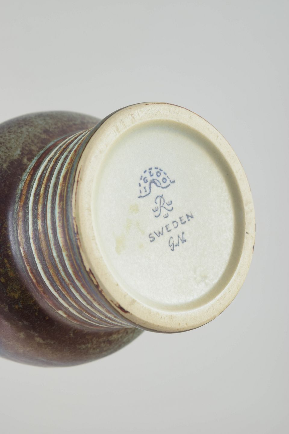 Karakteristisk cylindrisk form med svungen midtersektion og horisontale indskårne striber i lys glasur mod dyb brun-grøn bundglasur — et klassisk eksempel fra Nylunds eksperimenterende Igloo-serie.