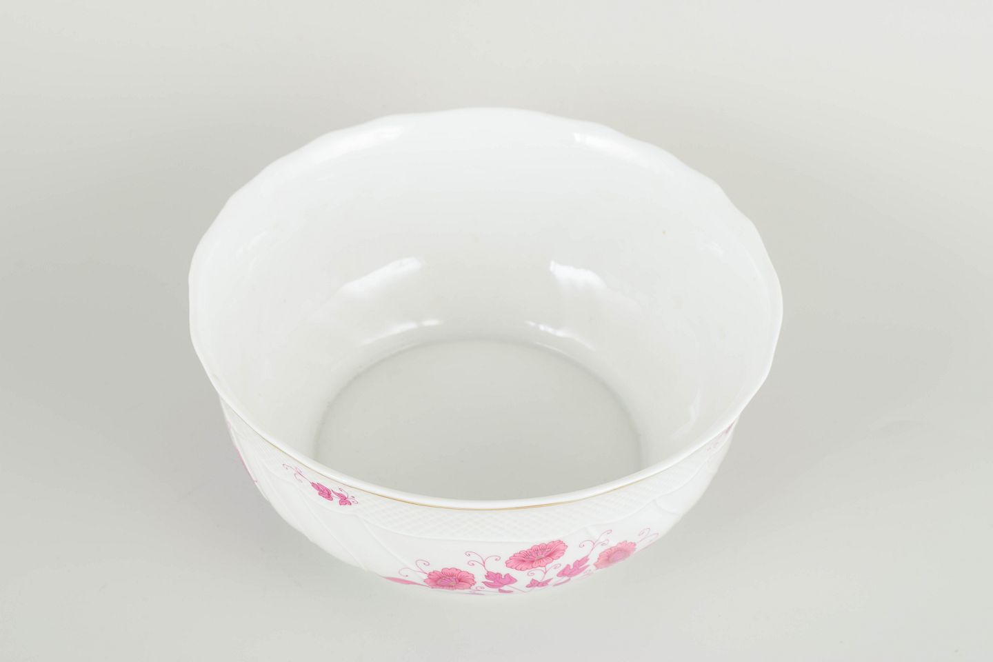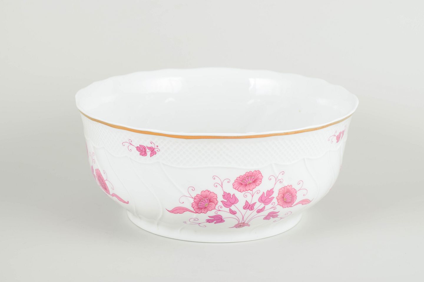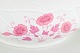 Hånddekoreret porcelæn med lyserøde blomsterdekorationer og forgyldt kant. Let bølget, klassisk form med reliefdetaljer i godset.