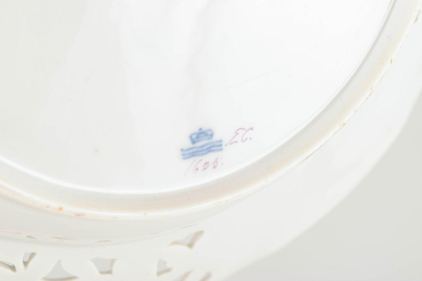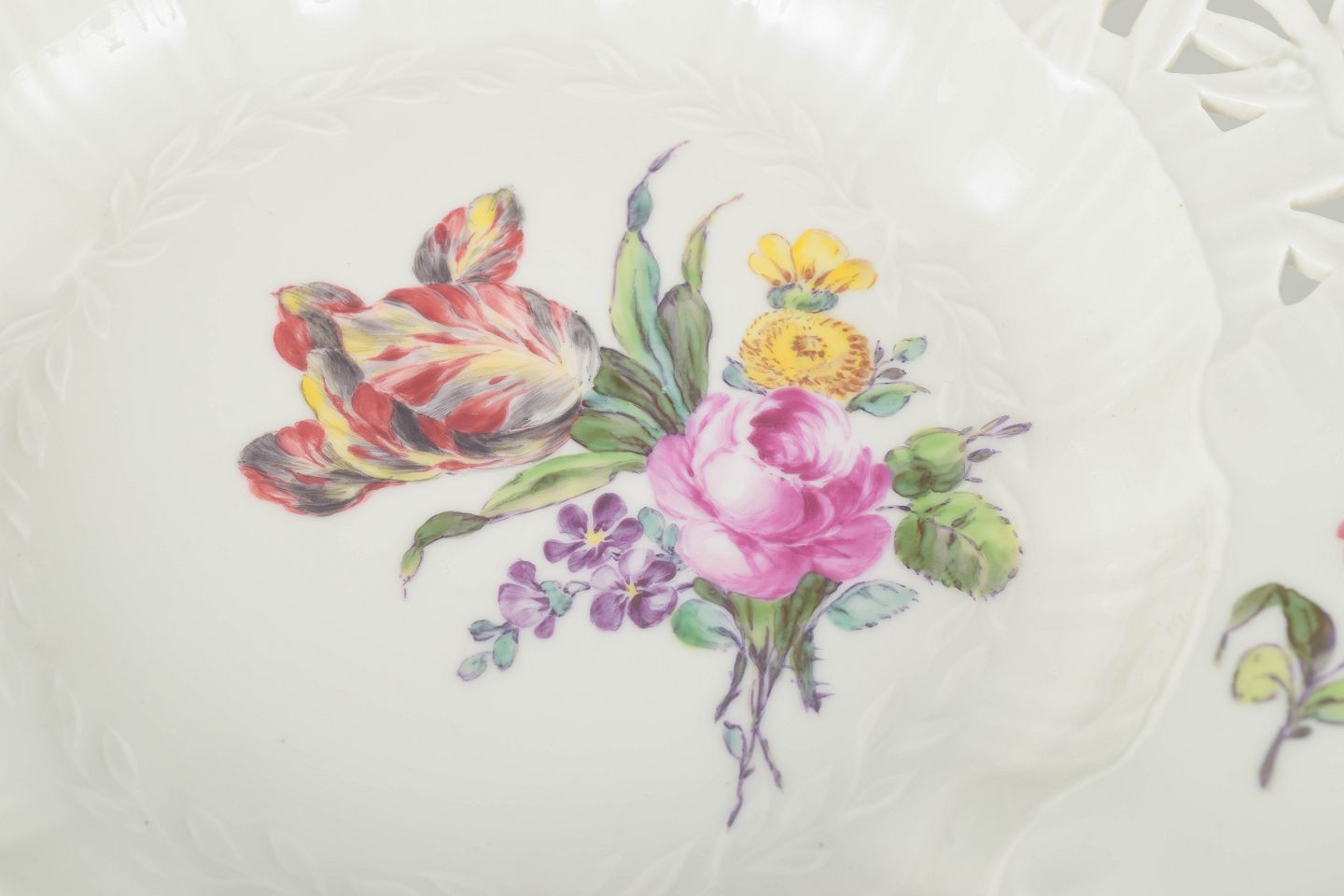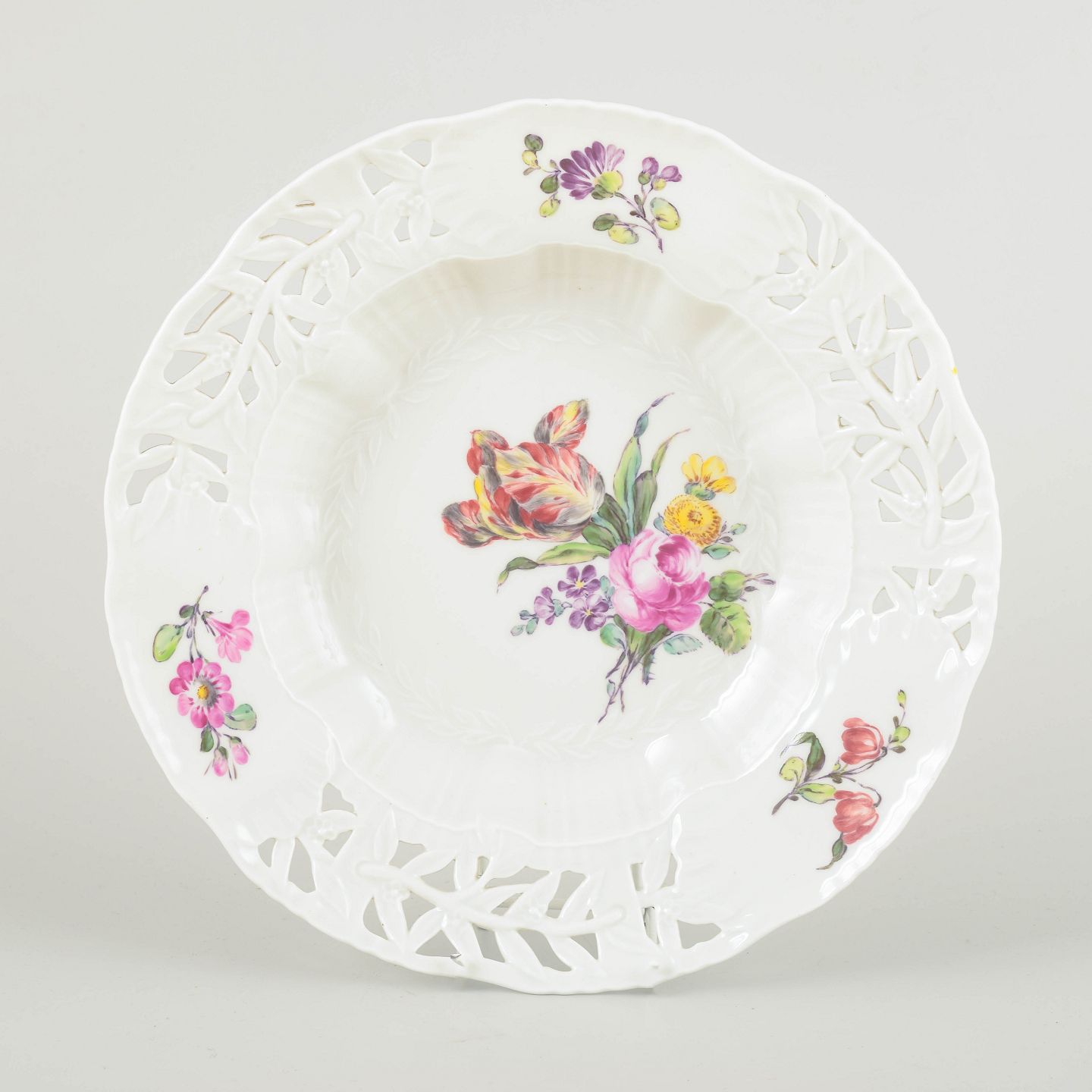 Håndmalet porcelæn med blomstermotiv i flerfarvet palet og gennembrudt bort i klassisk stil. Elegant dyb form med rigt dekoreret spejl og raffineret håndværksdetalje.