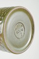 Cylindrisk stentøjsvase med todelt glasur — øverste halvdel med brun, geometrisk rutet reliefstruktur og nederste del med lys gul, taktil lavaglasur. Klassisk eksempel på Atterbergs kombination af taktile overflader og nordisk farvepoesi.