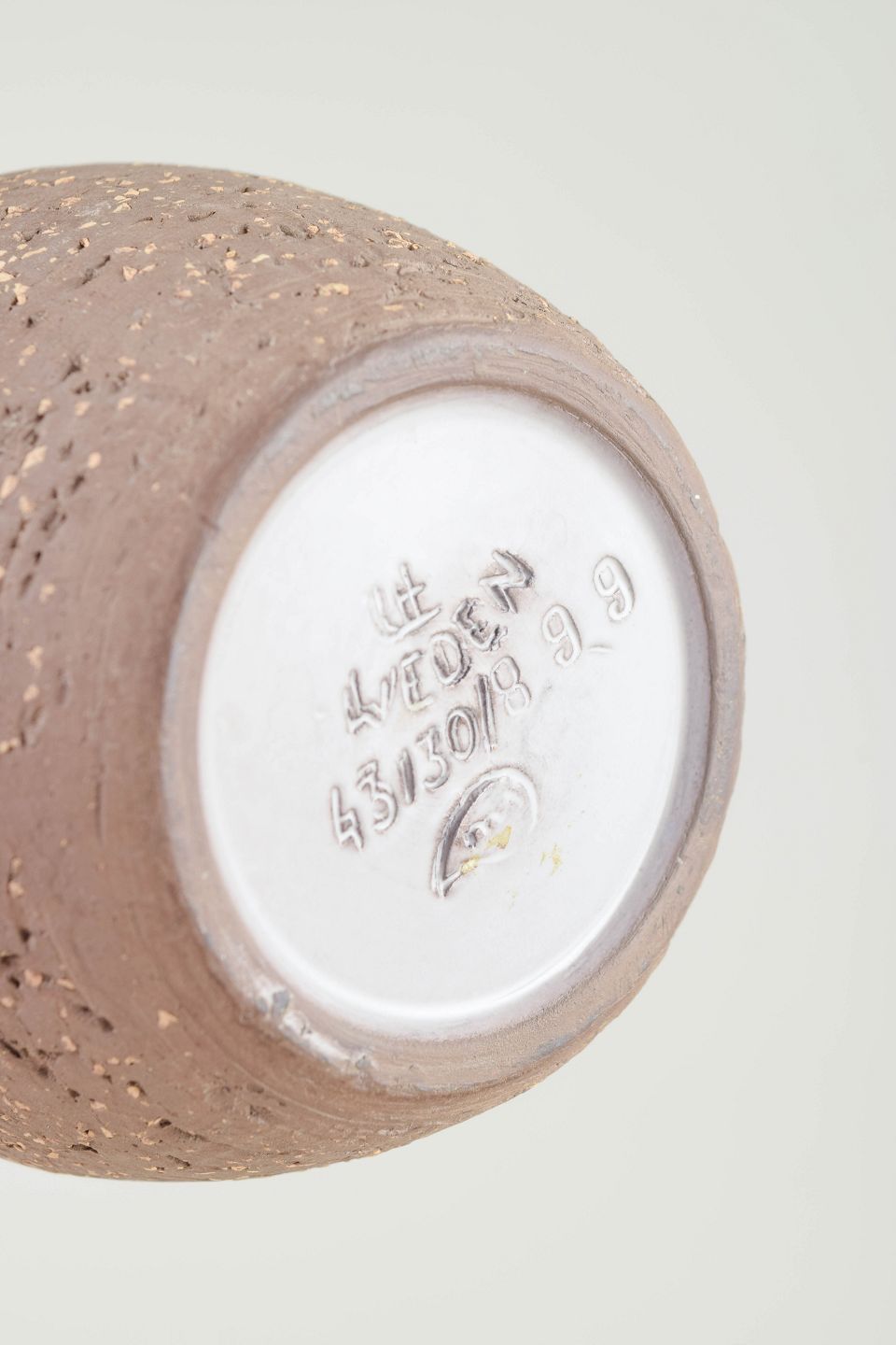 Dekorativ stentøjsvase i organisk form med mat, brun strukturoverflade på den nederste del, bånd med hvide cirkulære felter samt blankt glasurforløb i lysegrønne nuancer. Indvendigt udsmykket med dyb koboltblå glasur, som skaber en elegant kontrast.