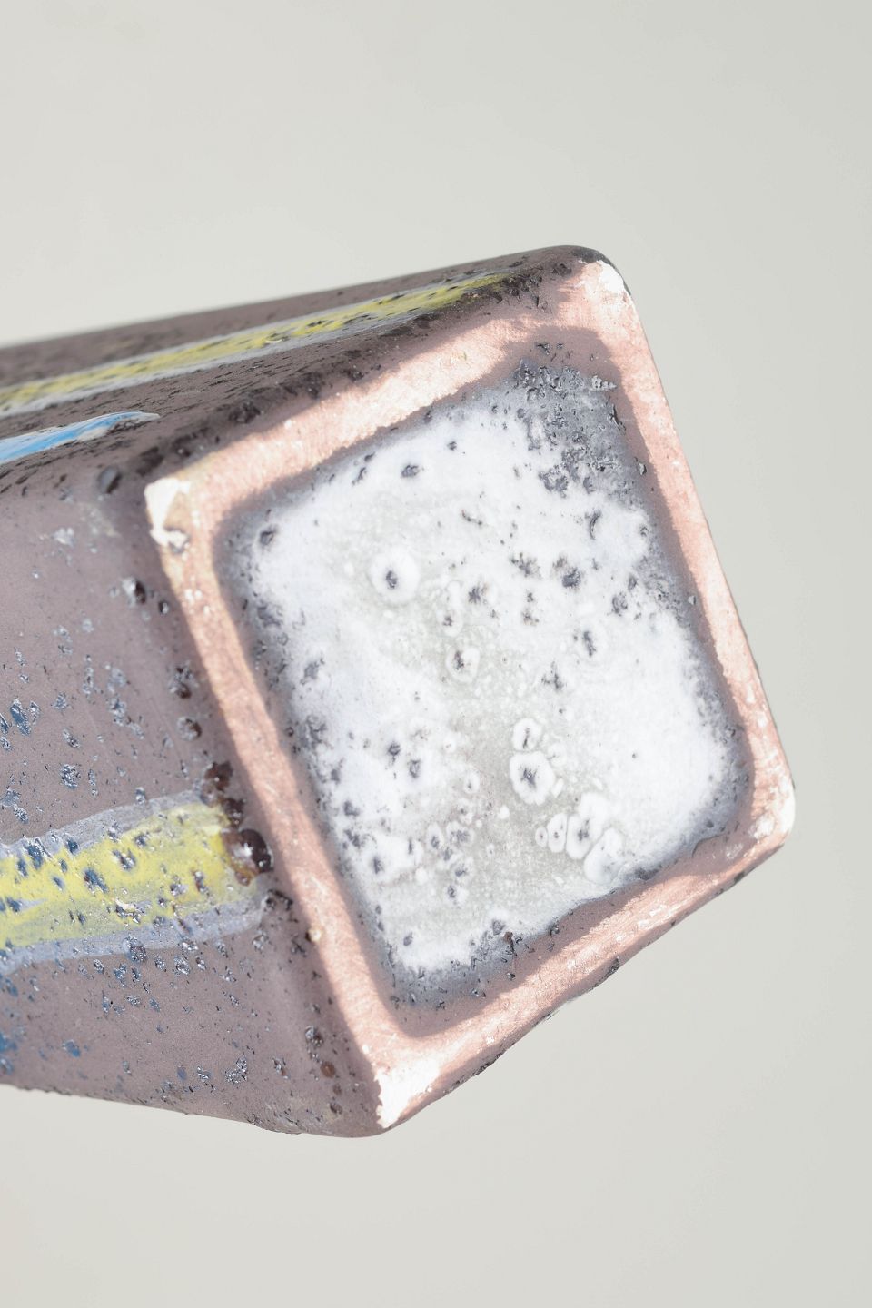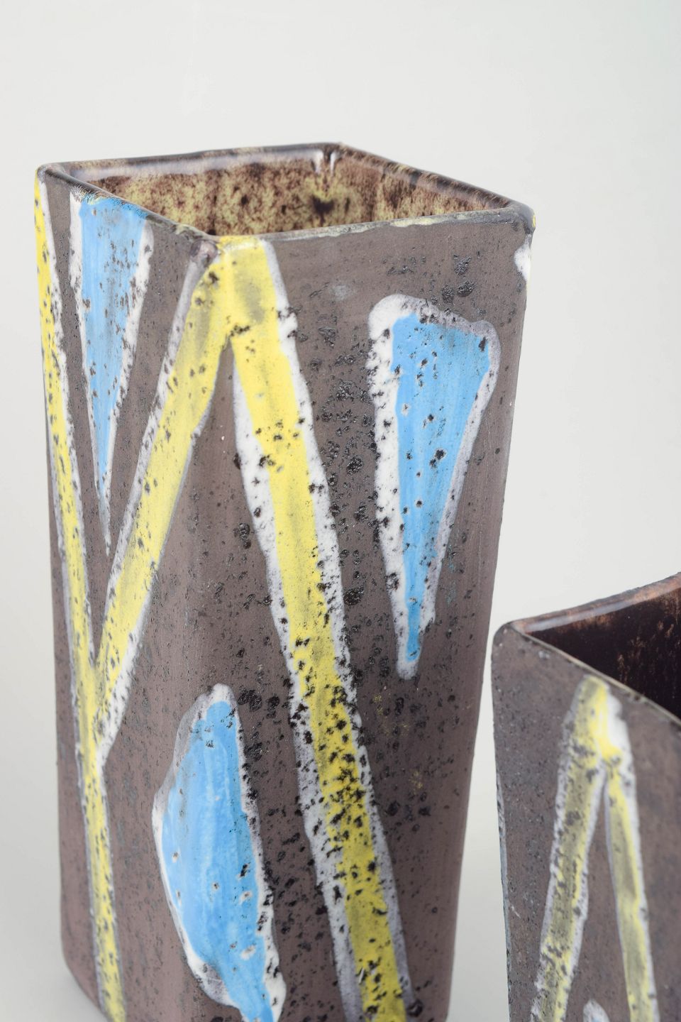 To unikke rektangulære keramiske vaser med grafisk håndmalet dekoration i relief med blå, gul og hvid glasur på mat brun chamotte-lignende stentøjsoverflade.