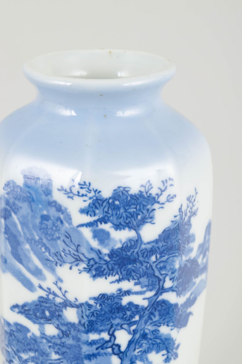 Elegant, håndmalet porcelænsvase i lyseblå glasur med dekoration af blå træer i klassisk kinesisk stil. Fin, slank form med smal hals og blød overgang til korpus.