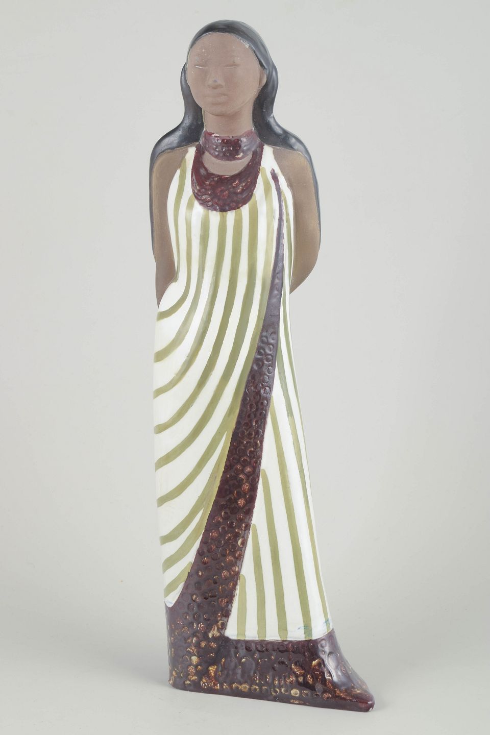 Stor håndmalet keramikfigur af en kvinde med langt hår, iført hvid kjole med grønne diagonale striber og brun dekorationskant med tekstur. Et elegant og roligt arbejde af Mari Simmulson, kendetegnet ved hendes karakteristiske stiliserede form og varme farvepalet.